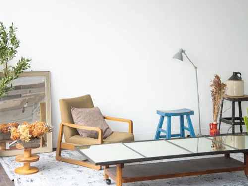 ヴィンテージソファとフェイクグリーンでナチュラルだけどかわいいリノベーションスペースです!