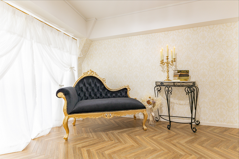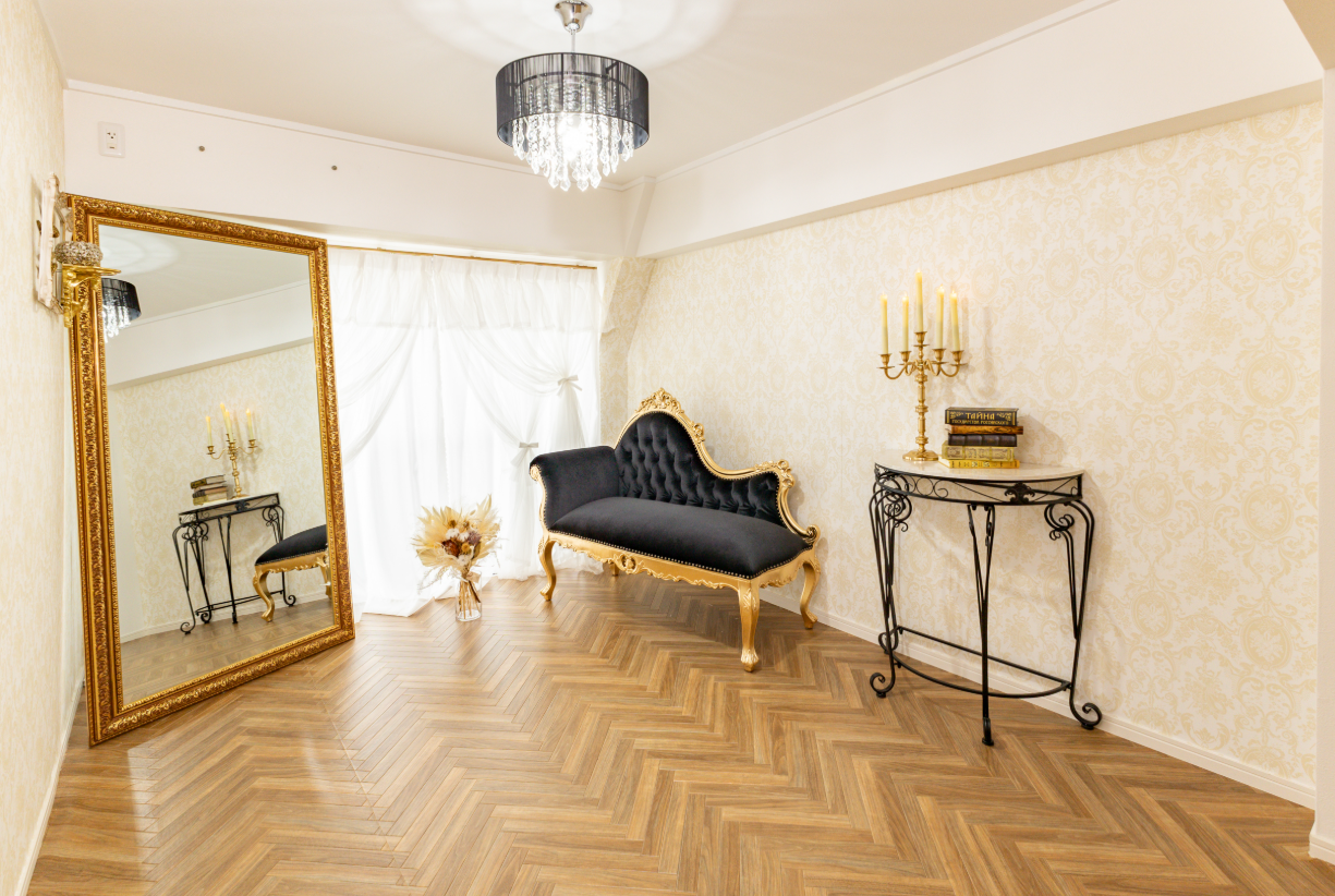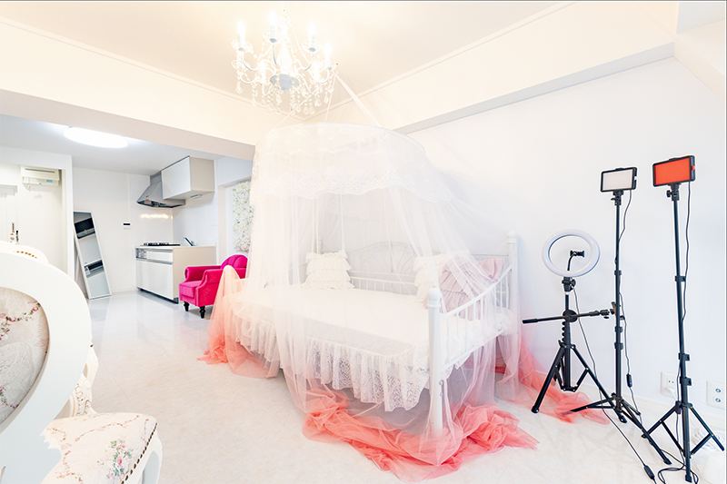 白を基調としたガーリーでお姫様テイストのブースと、木目床に黒と金のインテリアでシック&エレガントを演出したブースを併せ持つことにより、一度の撮影で様々なシーン撮影を実現可能です!