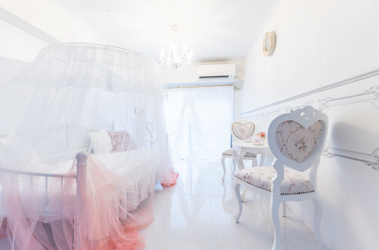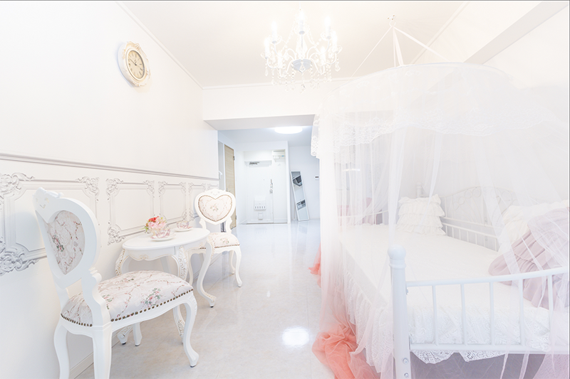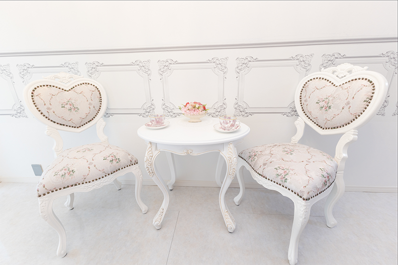 白ブースは天蓋付きベッドやロココ調のテーブル・チェアお花やクッションなど可愛さを引き立てるアイテムが充実!