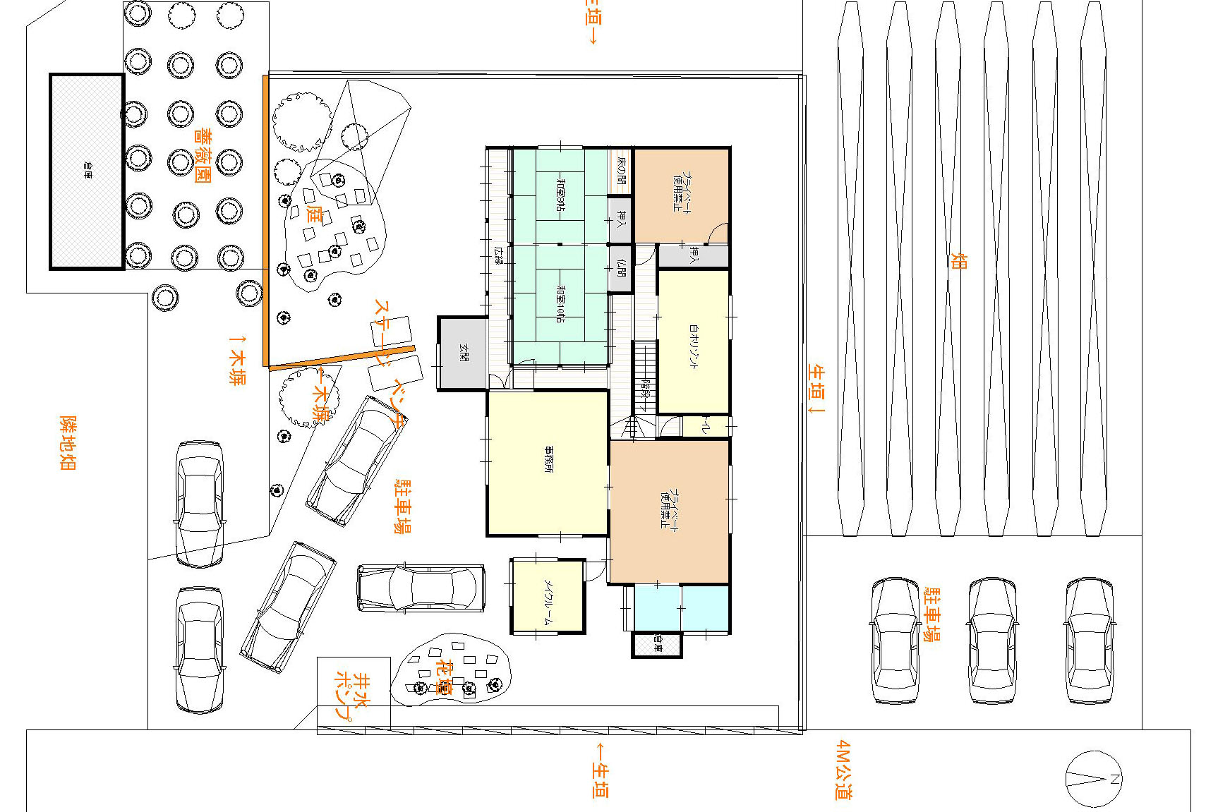 屋外和庭の南側には5月~11月頃迄開花のバラ約60株の小さなバラ園と北側の畑には春は菜の花(千葉県の花)夏には向日葵が咲き誇ります。