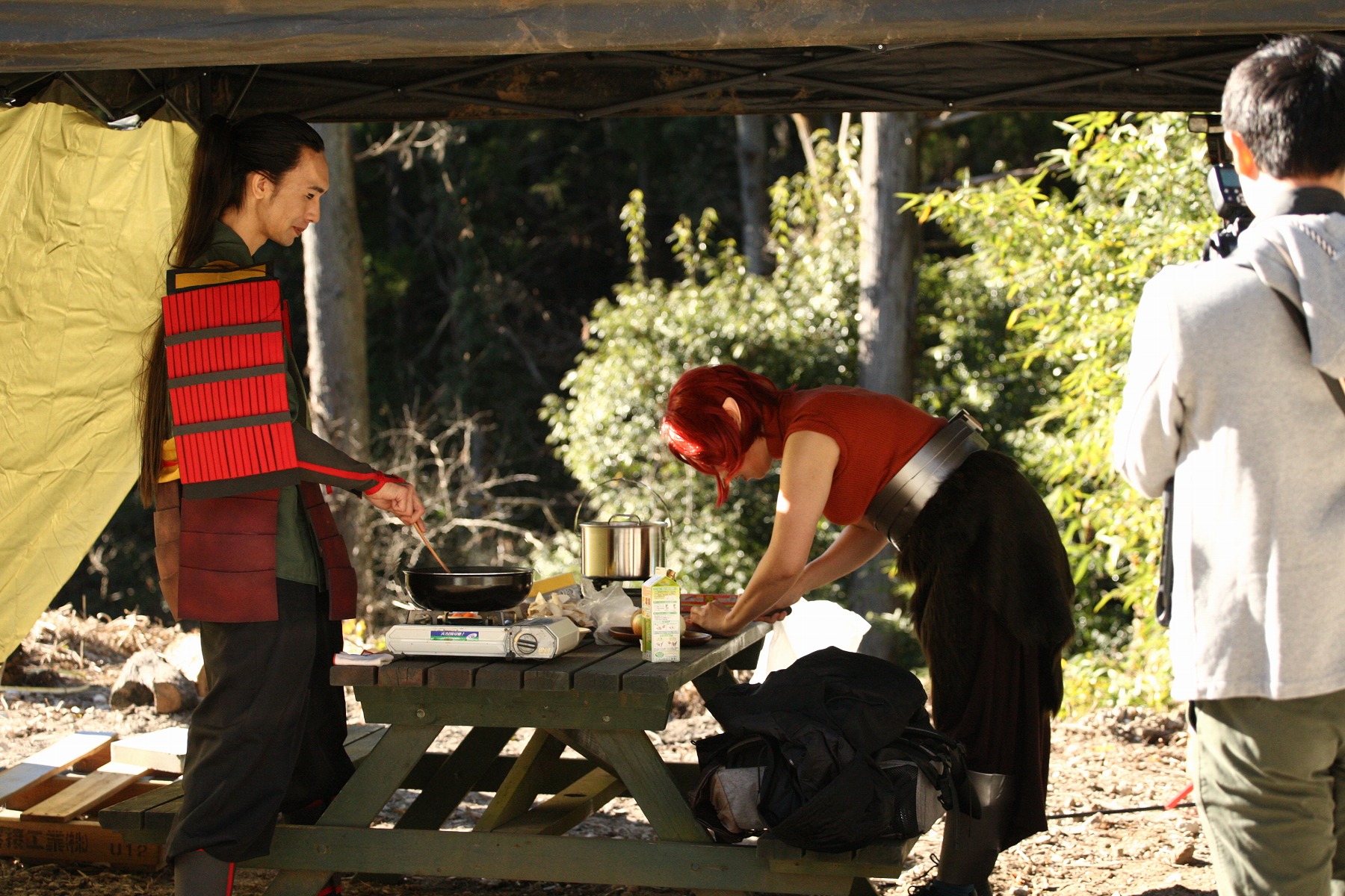 コスプレ衣装のまま、BBQやピザ焼き体験、バギー体験やキャンプに焚き火など通常サービスを利用することも可能です(写真はカレーを作っているところ)