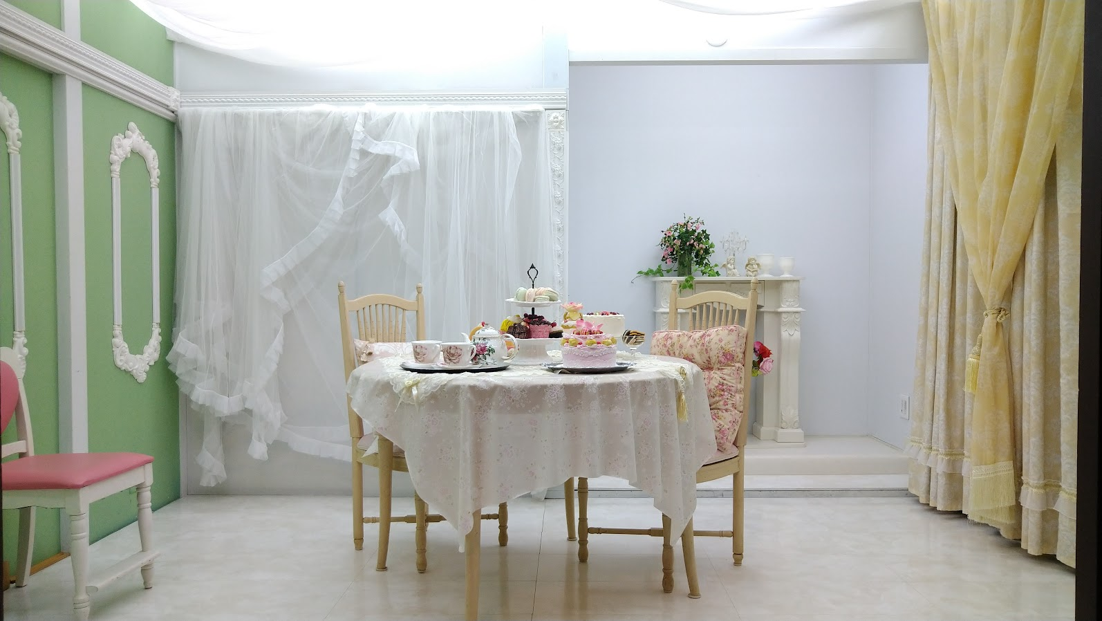 萌黄の部屋 はフレンチロココの可憐な装飾が広がり、スイーツを添えてお茶会シーンやガーリーな作品に最適です。