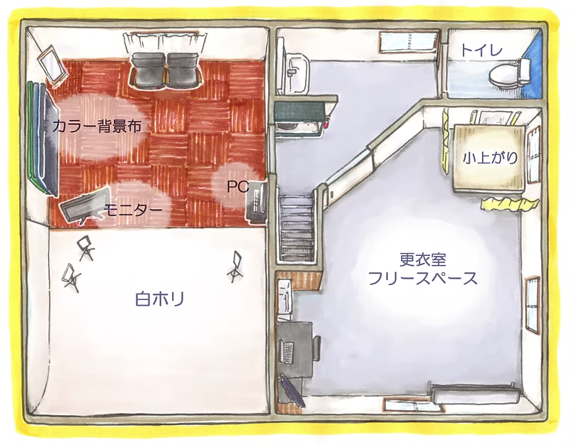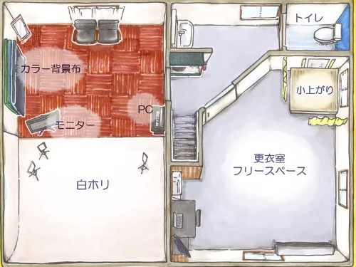 こちらは飲食持ち込みOKのため、長時間の作業でも快適に過ごせます。撮影スペースは飲食持ち込み不可ですが、撮影用小物の持ち込みは可能で、作品づくりに集中できる環境が保たれています。