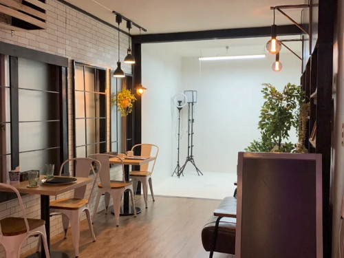 一方、木のぬくもりに包まれたカフェ風ブースでは、やわらかな自然光が差し込み、ナチュラルで優しい雰囲気の撮影を実現。