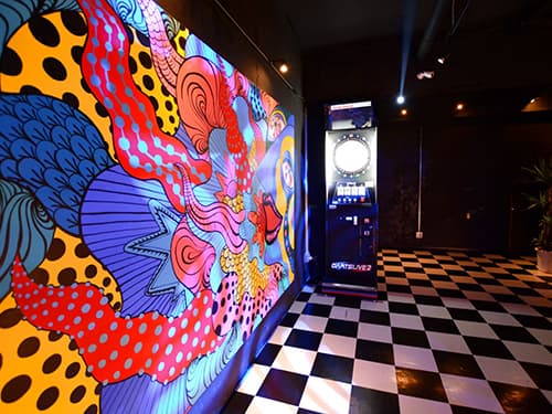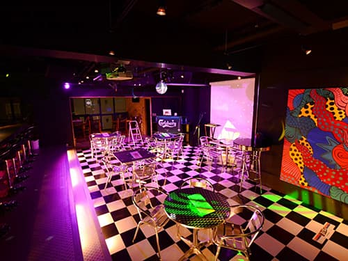 ロケーションもバーカウンター・バーテーブル・アート壁面にレンガ壁面、市松模様の床など、アッパーな空間になっているので、ぜひテンションの高い撮影シーンにご活用ください。