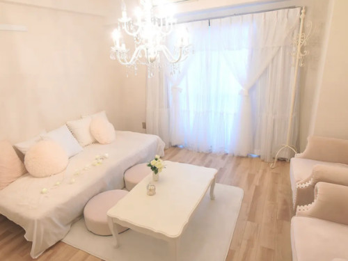 室内は白を基調としたシンプルで可愛いインテリアが整えられており、推しカラーの装飾や小物を持ち込むことで、作品やキャラクターのイメージに合わせた撮影空間を自由に演出できます。