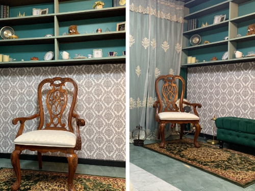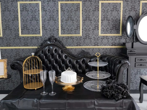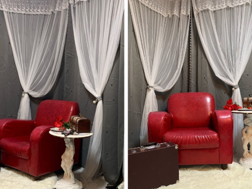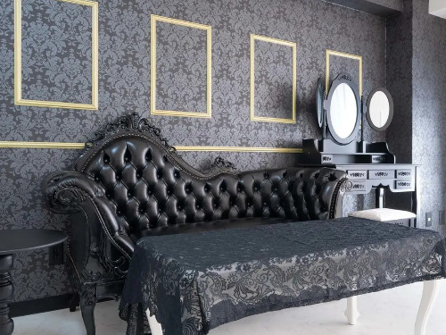 スタジオ内にはロココ調ソファやシャンデリアが設えられており、コンパクトながら本格的なクラシカル撮影が可能。