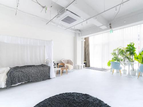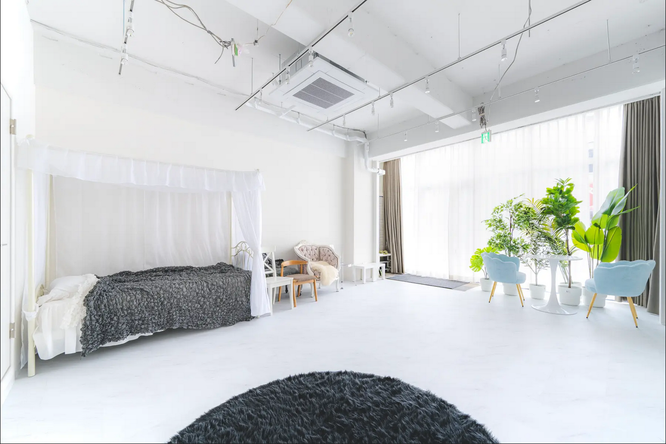 天井照明や全身鏡、ドレッサー、撮影用ベッドなどを完備し、カメラ1台で多彩な世界観を表現できる贅沢な空間が広がります。午前中からお昼過ぎにかけては自然光が豊かに差し込み、キャラクターの魅力を引き立てる柔らかな光で、ワンシーンごとに奥行きのある写真が撮影できます。