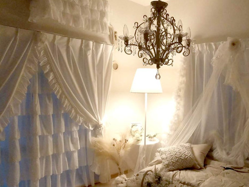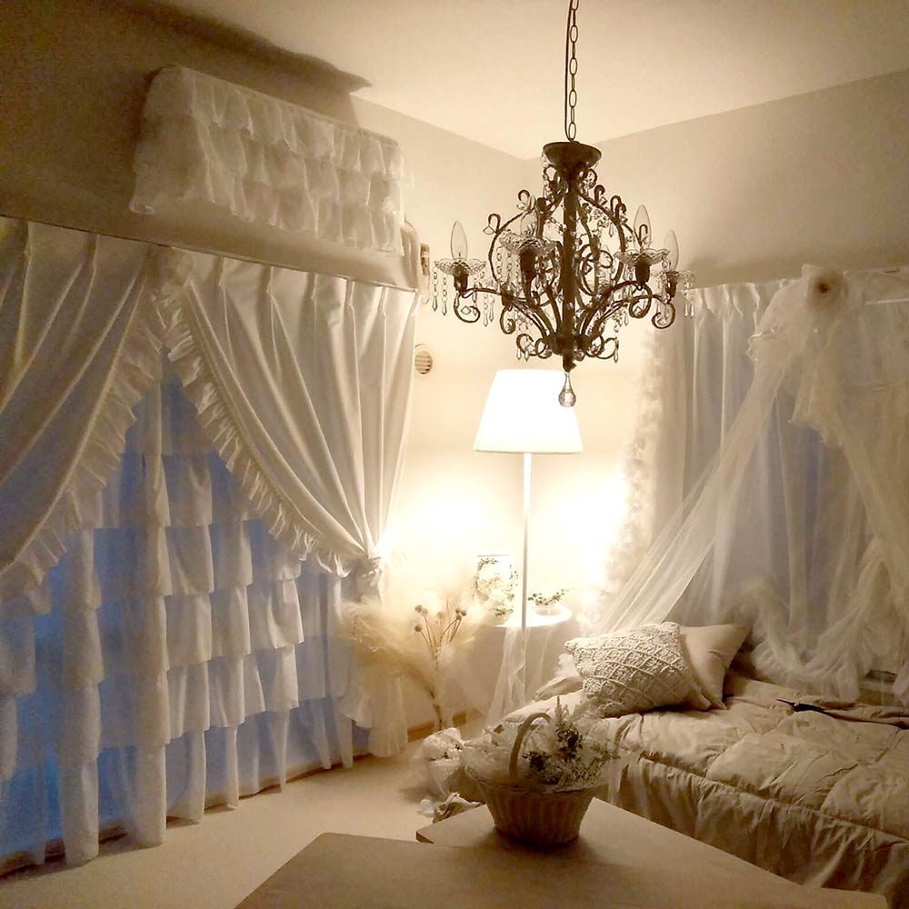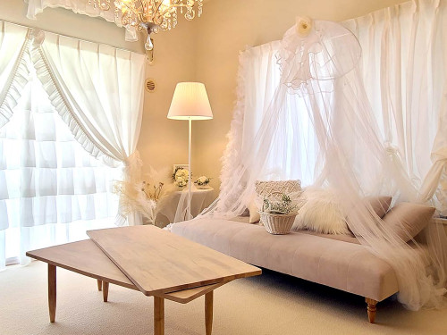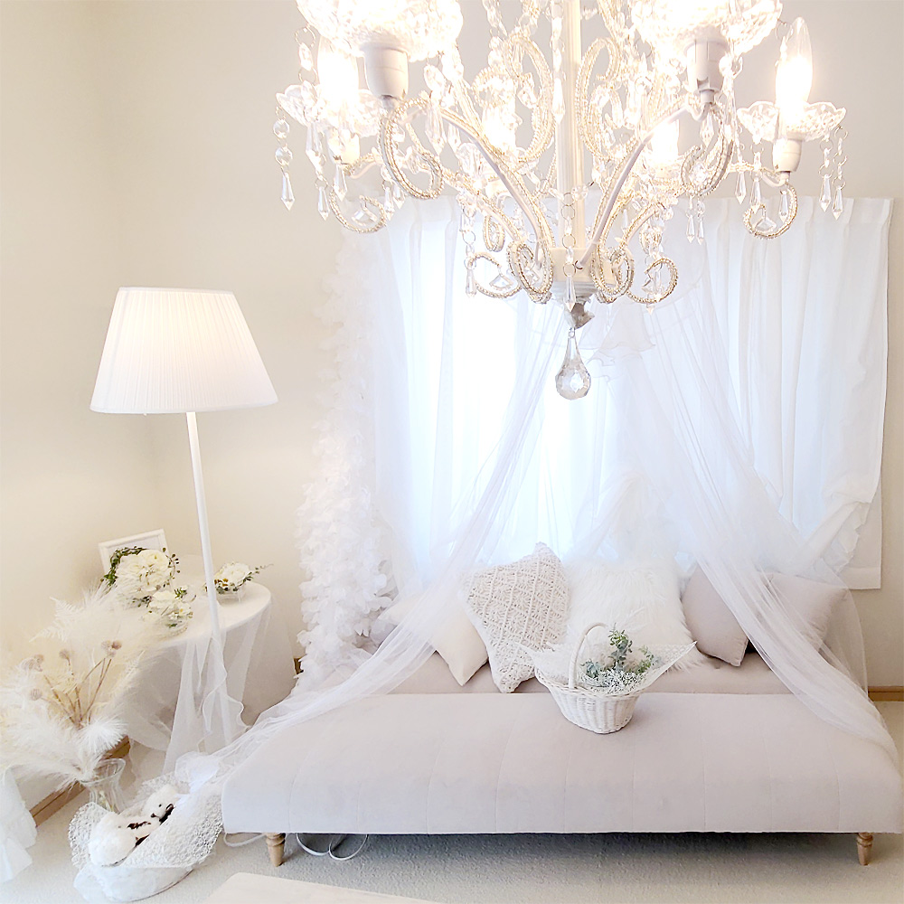 ドアを開けた瞬間、ホワイトレースとシャンデリアの輝きに包まれ、まるで物語の世界に迷い込んだかのような雰囲気。生クリームのようにやわらかなレース装飾や、モルタル調の壁、ドライフラワー風ブーケが、ロマンティックかつシャビーな世界観を演出します。
