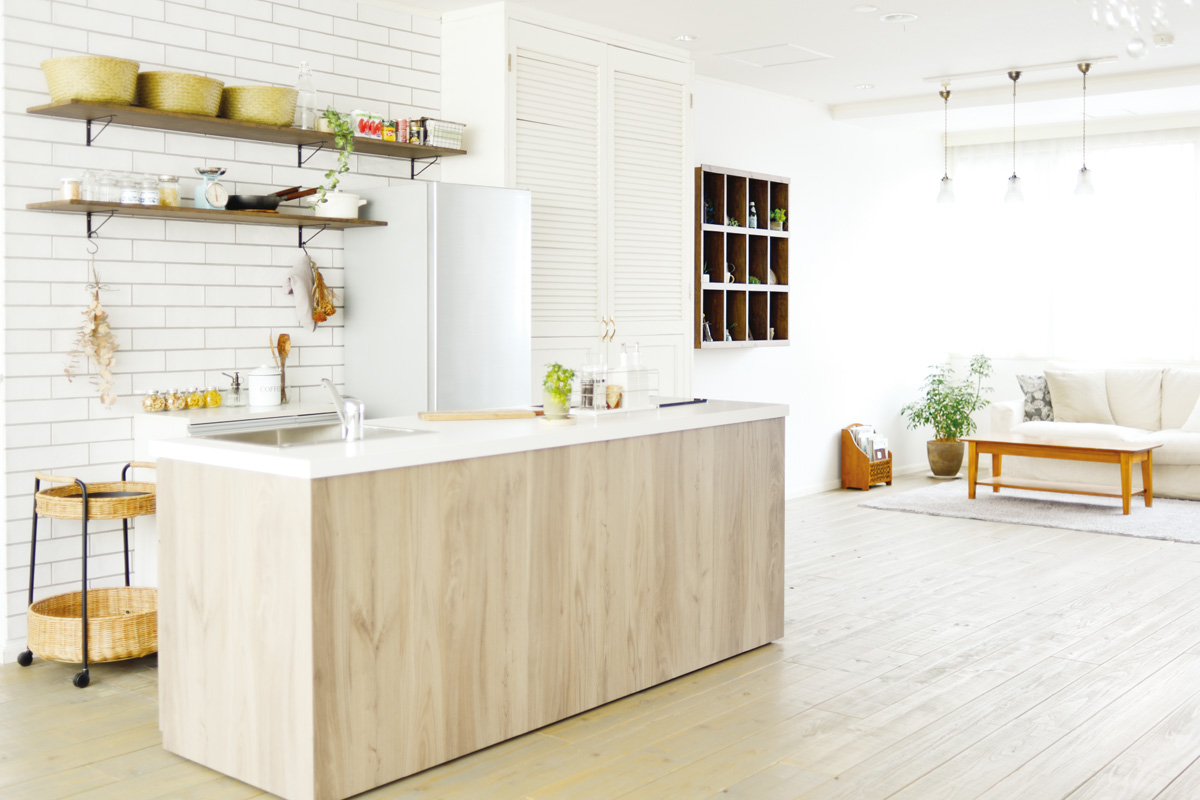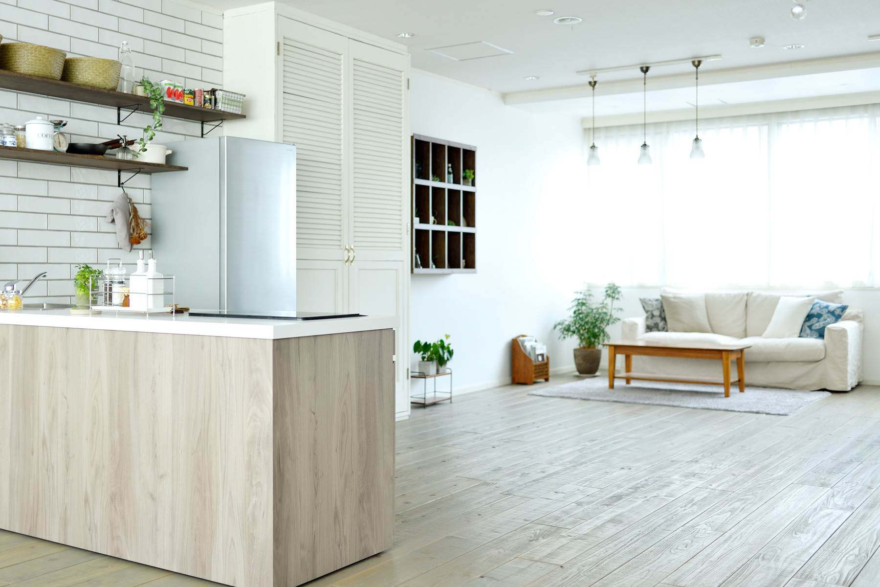 メインルームは、天然木のダイニングテーブルやウッディーな家具が並ぶ広々としたリビングダイニング。