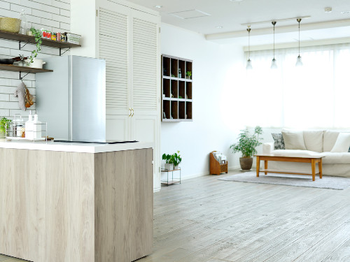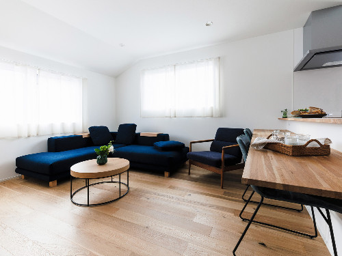 約50平米の1階メインフロアは、USED感のある天然木フロアにナチュラルなアイランドキッチンと大きなダイニングテーブルを配置。