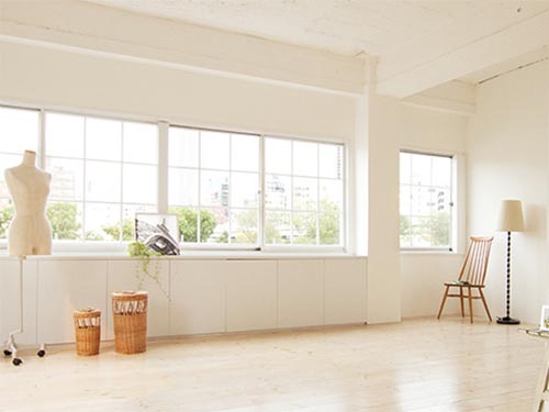Studio Tenjin Baseは木目調の床と白壁、2面の窓から差し込む自然光が、柔らかい雰囲気に包まれた空間を演出します♪