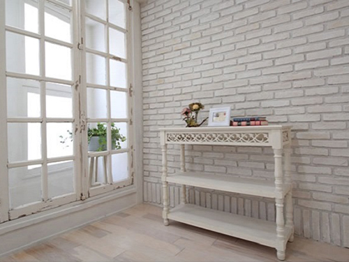 本物のレンガを使ったレンガウォールや年代物のアンティーク窓がそのまま埋め込まれた壁、ホワイトステインを施した無垢材のフローリングなどビンテージな空間。家具もウォッシュ加工のカジュアルなソファにピンクチェストなどコンセプトに沿ったアイテムや雑貨を配し、仕切り壁のグレイッシュブルーのペイントが印象的なスイート&ポップなガーリーなインテリアとなっております!