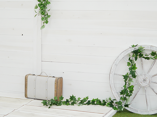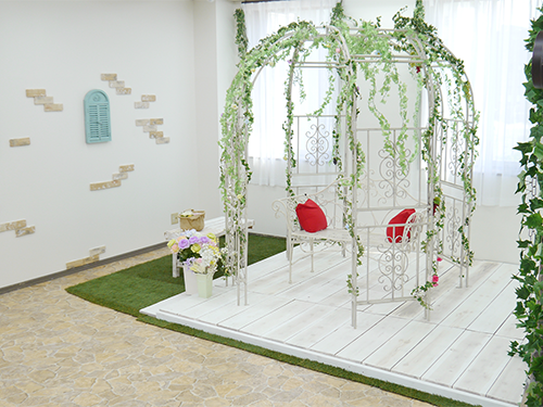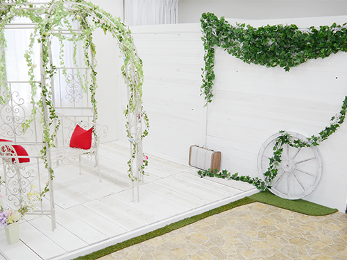 白を基調としたイングリッシュガーデンをイメージしたスタジオは雰囲気バッチリ!