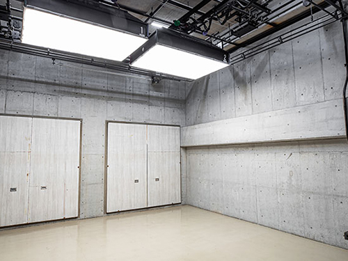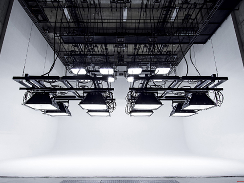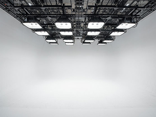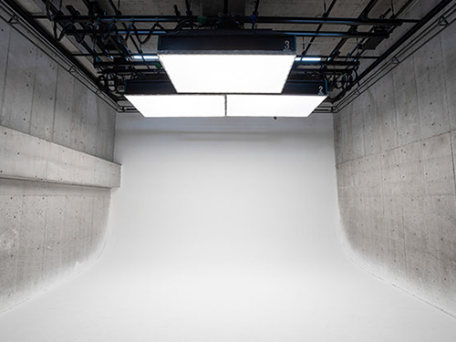 「studio CUE」は4つのスタジオがあり、天井高9.7m・ライト下高6.6m.1面アールホリゾントは約110㎡と広く使え、車両撮影までできるSTUDIO1。