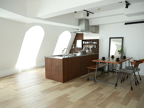 1Fはナチュラルな雰囲気のキッチン・リビングスペースとなっており、料理風景や食事風景など日常のワンシーンを切り抜いた撮影にご活用いただけます。