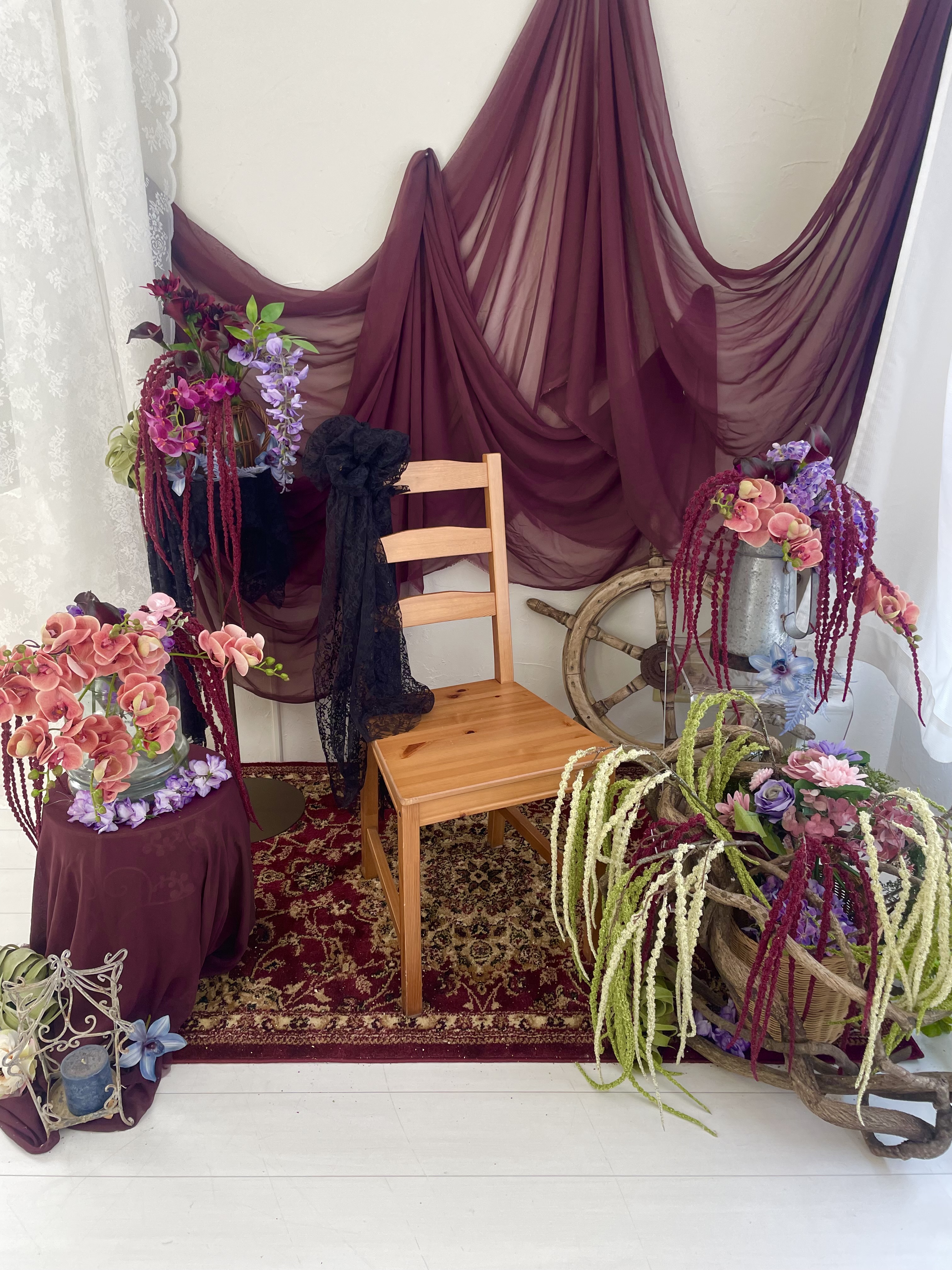お花の外にも和傘や額縁・各種チェアなどの撮影小物も充実な上、その他小物の持ち込みも自由なので自分の好みに合わせてカスタマイズして撮影が可能ですよ。