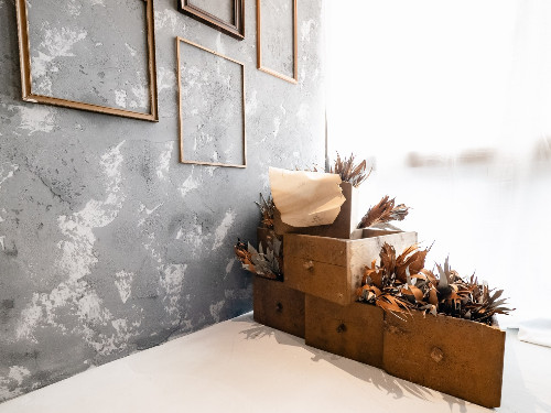白・赤レンガの壁、全面黒板、白壁もありますが、バック紙を利用するとさらに違った雰囲気へ◎