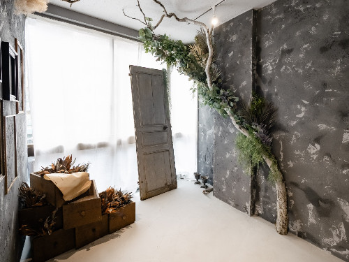 コンクリ壁面の廃墟風雑居ビルスペース・白ホリ×自然光の柔らかい雰囲気のフロアに加え、屋上スペースも使える贅沢な撮影スペースとなっております。