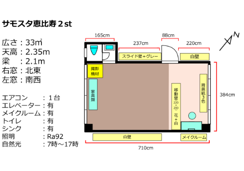 同ビルに50㎡の1号店、全て白の3号店があり、大規模な撮影会にも対応可能。