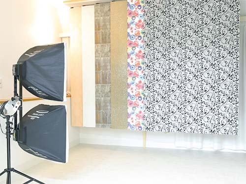 ペーパーバック以外にも白レンガ壁面、柄モチーフのバックパネルをはじめ、会議室のようなセッティングやヨガマットなどもあり、シンプル背景以外にもシチュエーションを凝らせることが可能です。