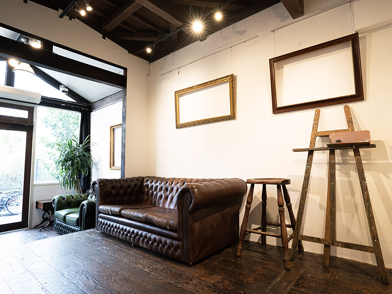 白壁に本物のアンティークが良く映える『画廊』をイメージした撮影スタジオ