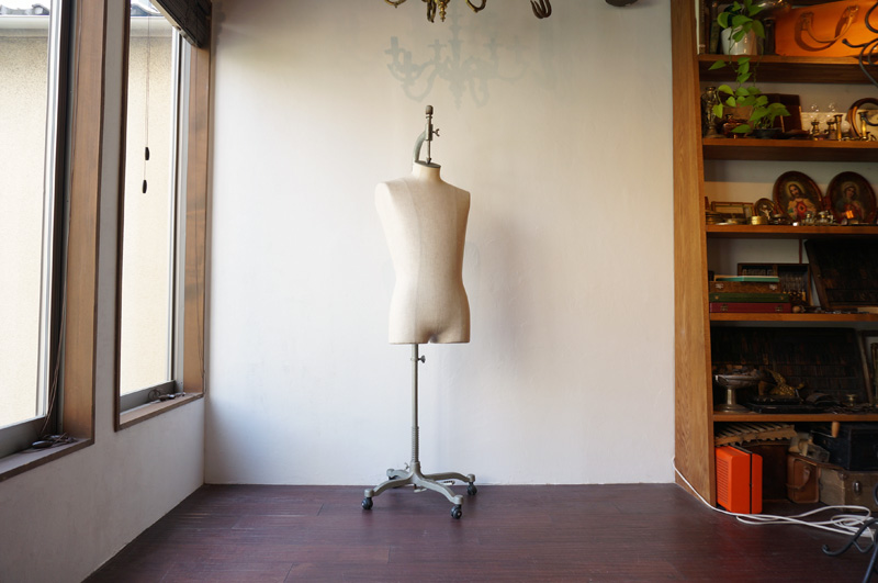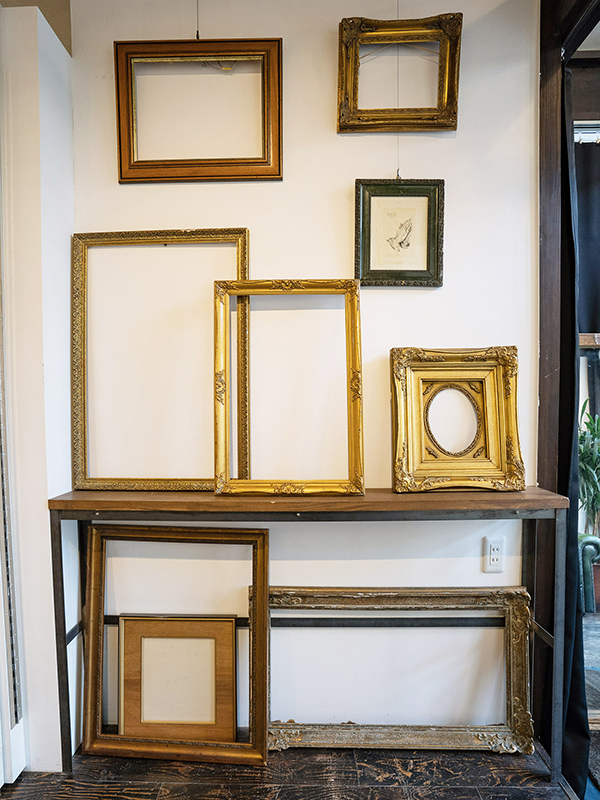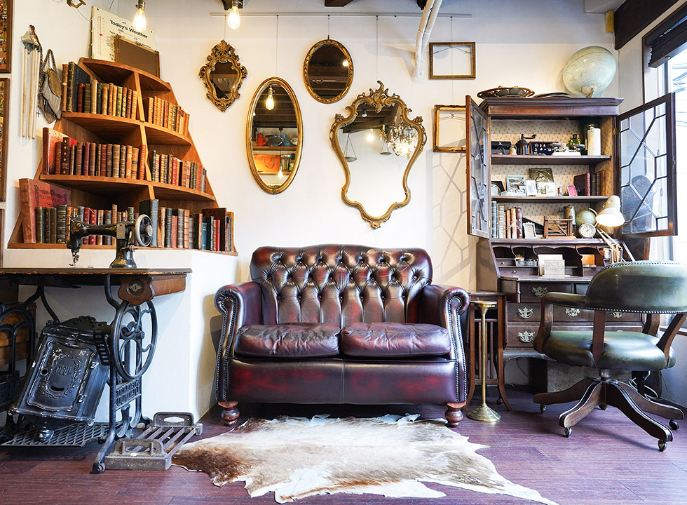 古い外壁のような壁を背景に、ヨーロッパで仕入れた本物のアンティーク品をディスプレイ
