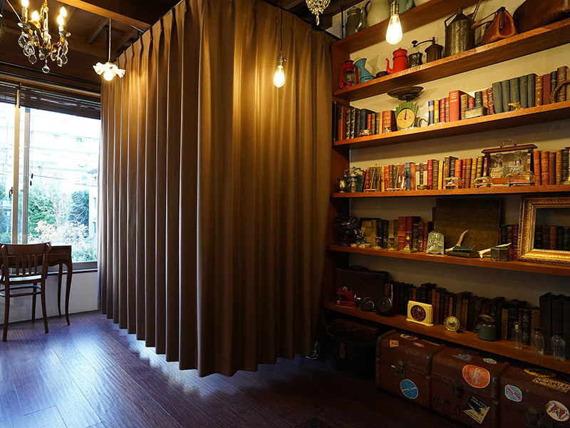 L字に設置された本棚には1000冊以上のアンティーク洋書をディスプレイ