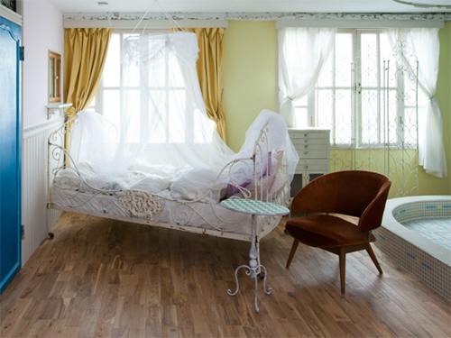 天蓋レースが天井から下がったベッドは、少女の寝室のような雰囲気がGOOD!
