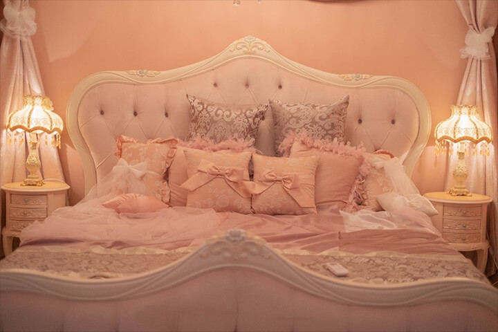 プリンセスルーム①姫系のガーリーなベッドは撮影映え間違いなしです♪