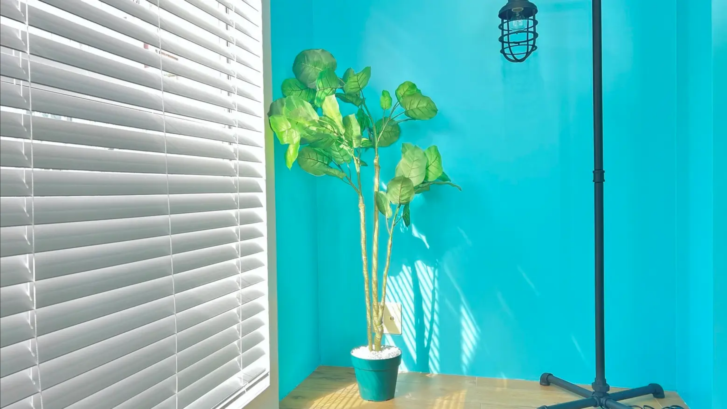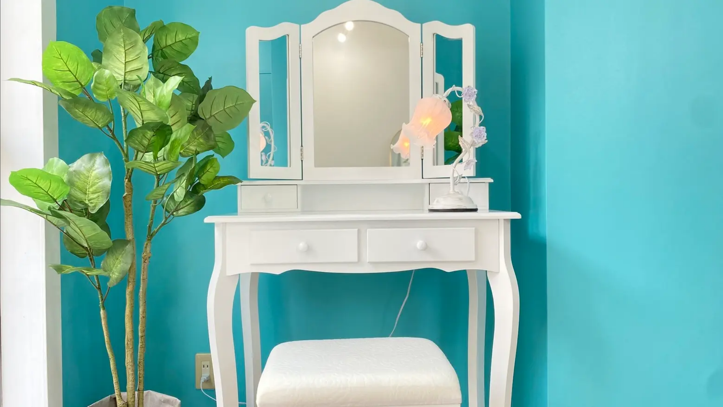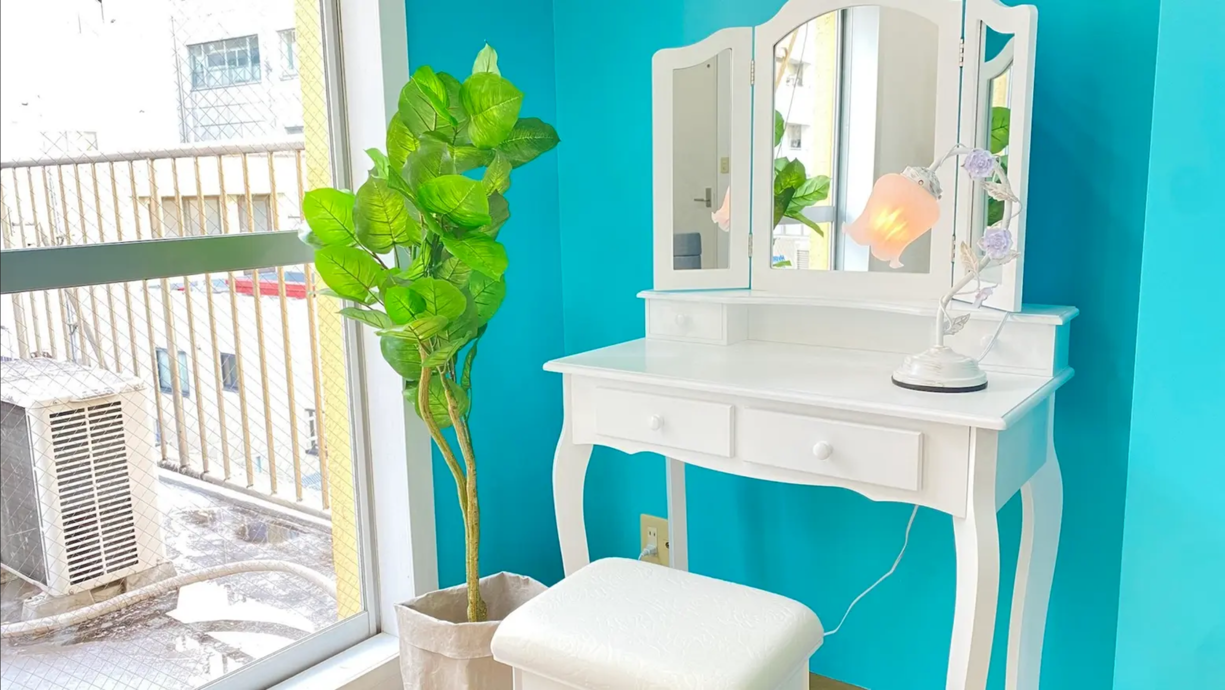 床・壁を2分割し、ホワイトゾーンと、ティファニーブルーの壁