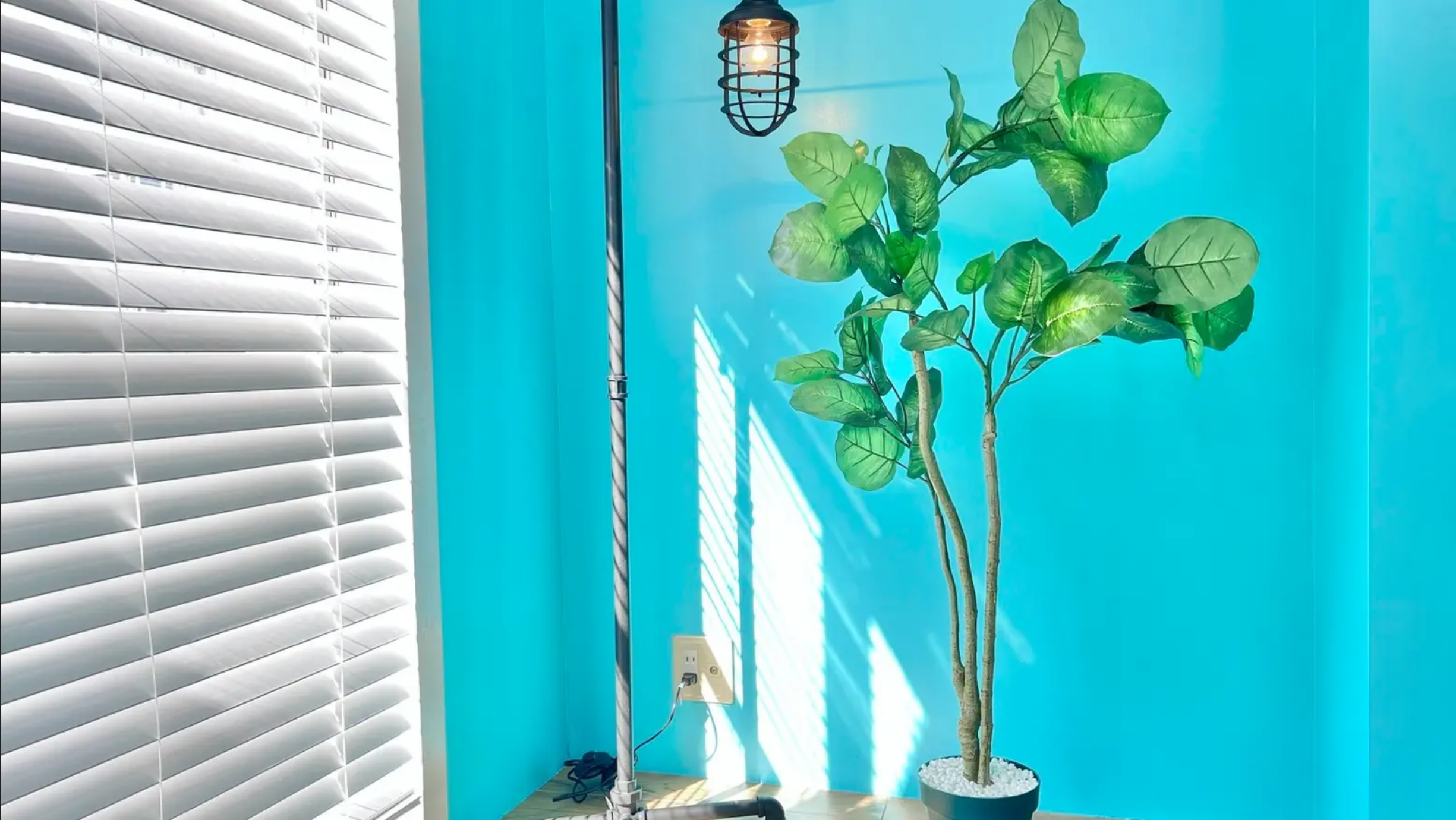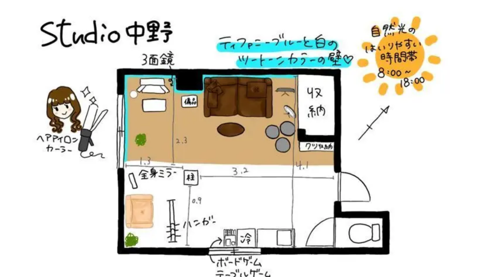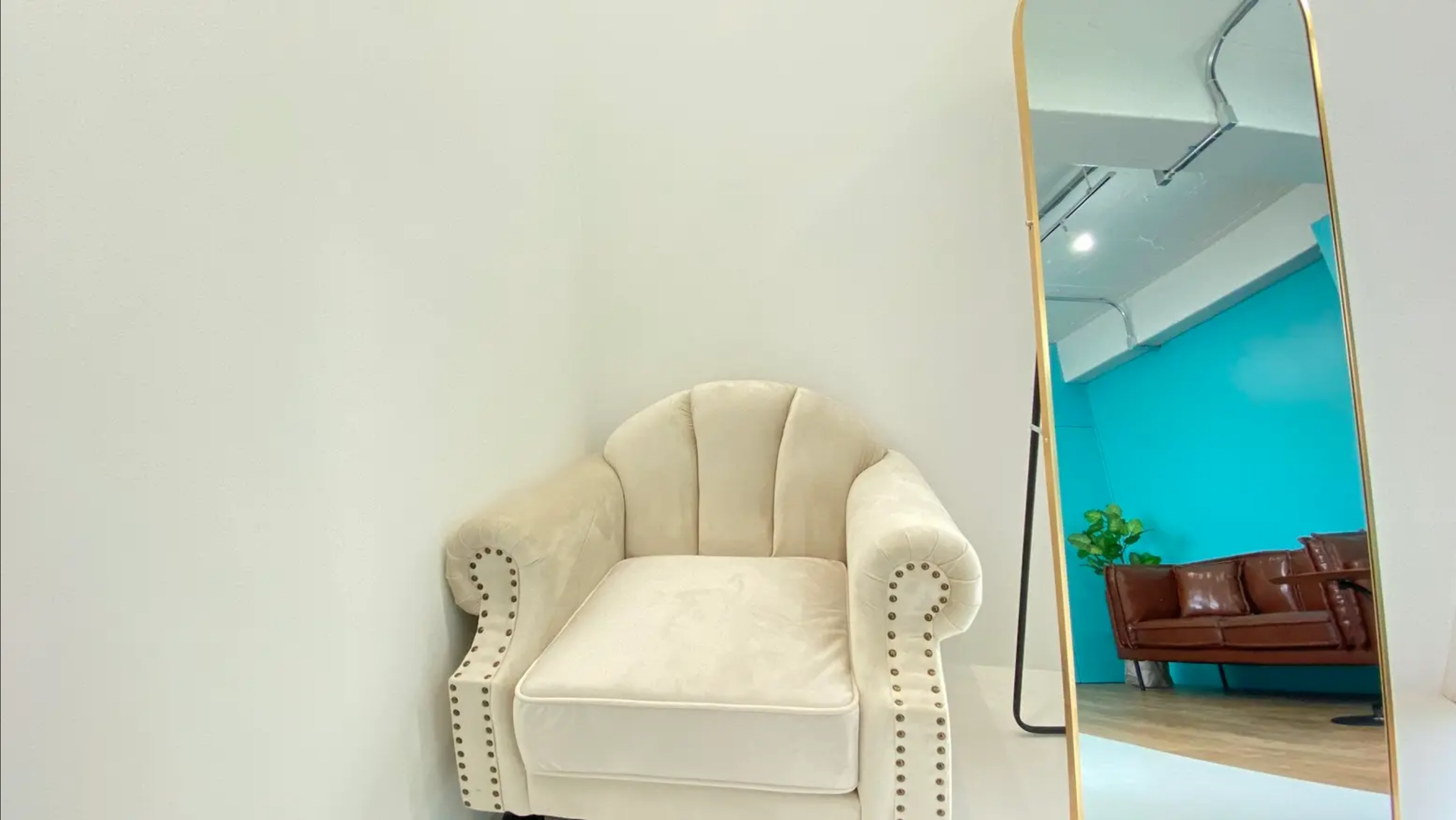 床・壁を2分割し、ホワイトゾーンと、ティファニーブルーの壁