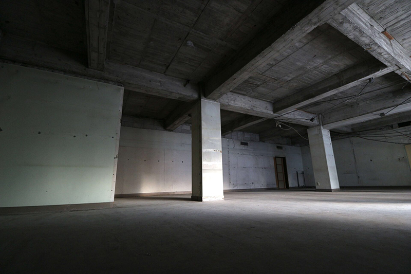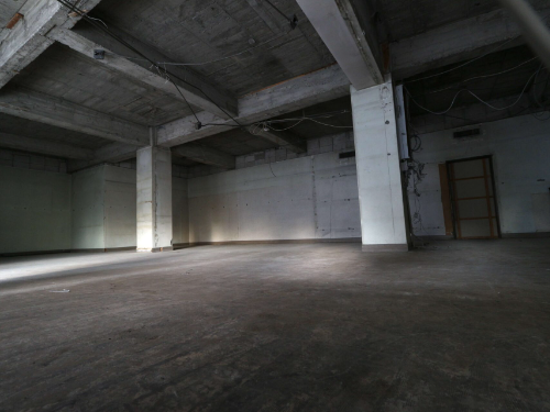 コンクリート打ちっ放しで、内装を一切いじっていない、完全なスケルトン状態のスペースです。幅12.7m、奥行8m、天高3m (梁まで2.5m)あります。