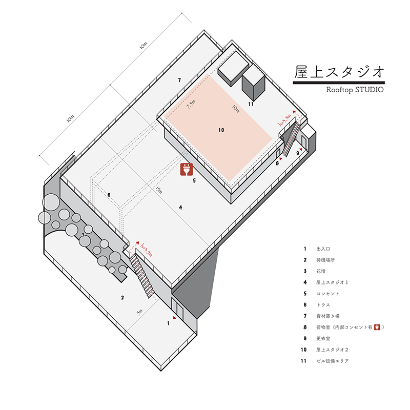 都内では最大級の広さを誇る屋上が貸切利用できます。総面積は300㎡以上。様々なアングルからの撮影ができます。コスプレ撮影以外にもMVやCM撮影にもご利用いただけますよ。