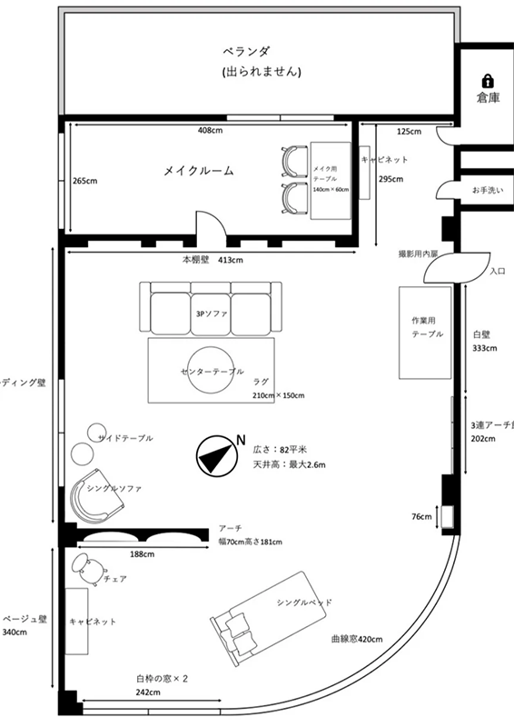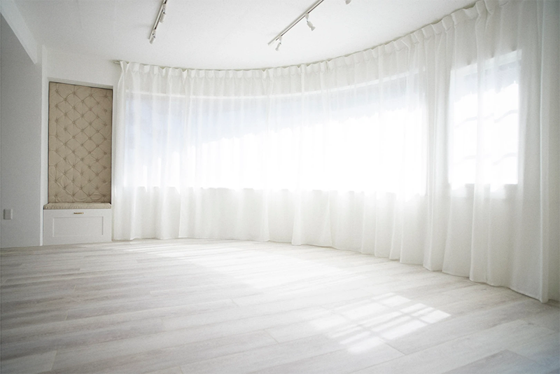 黒窓枠のスペースは壁が幅6mのカーブ状になっており、大きな窓からの自然光を活かした撮影がお楽しみいただけます。