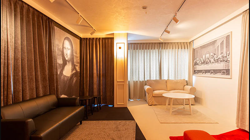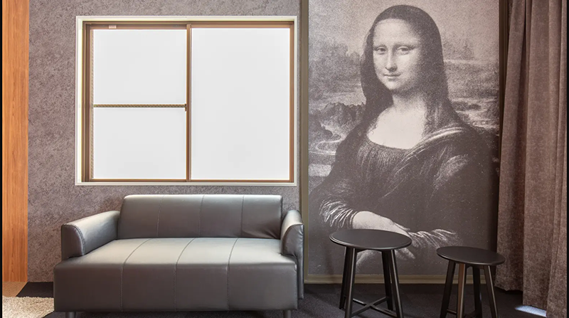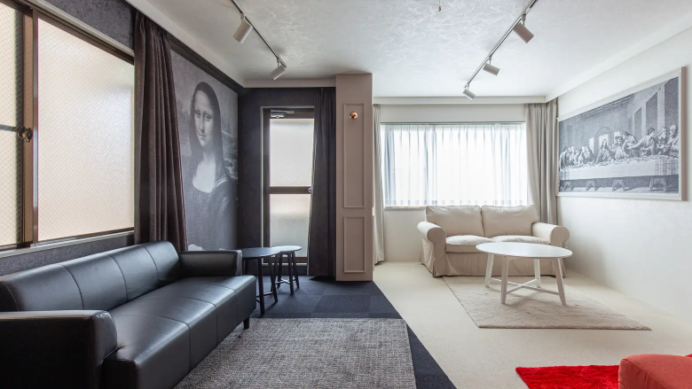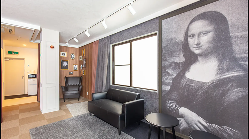 大きなモナ・リザが印象的なグレーベースのダークなスペース。