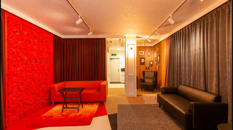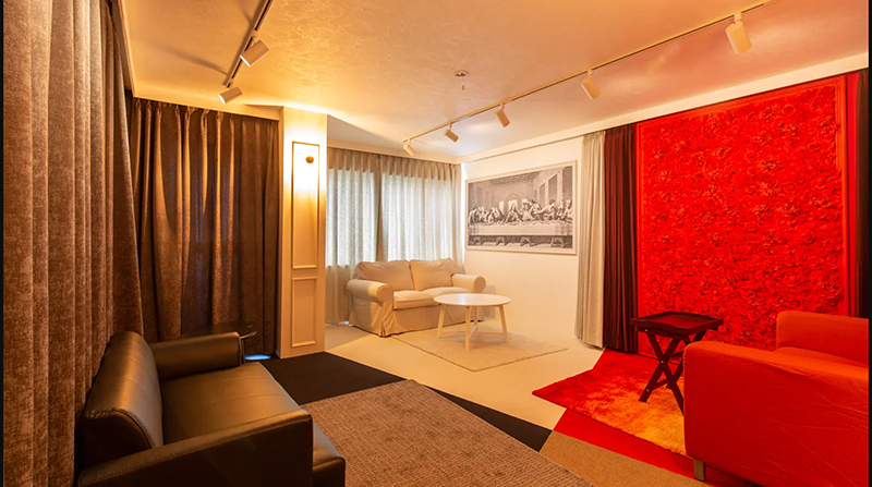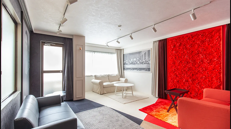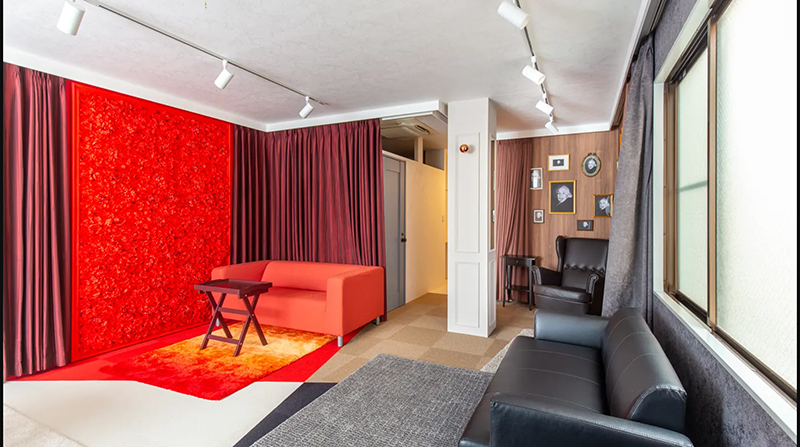 そして何といっても赤で統一したカーテンとソファ・薔薇のフラワーウォールは映え間違いなし!