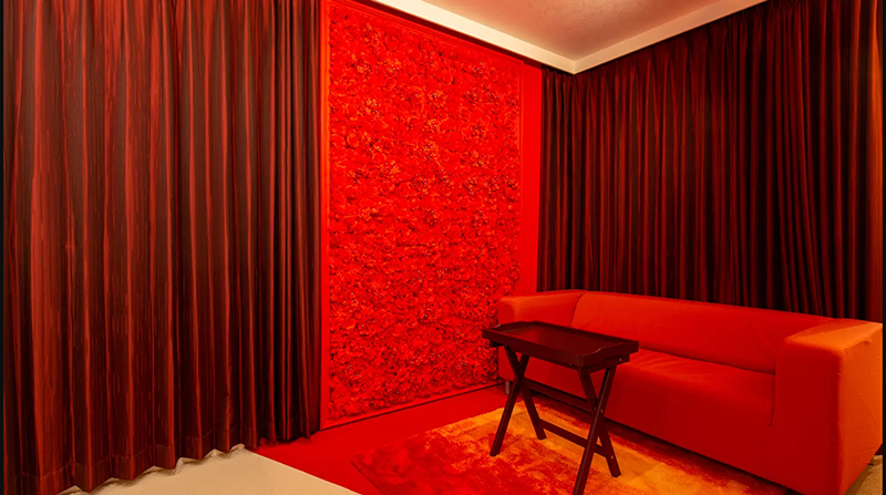 当スタジオイチオシロケーションのフラワーウォール。全体的に赤い空間で高級感のある撮影が可能です。