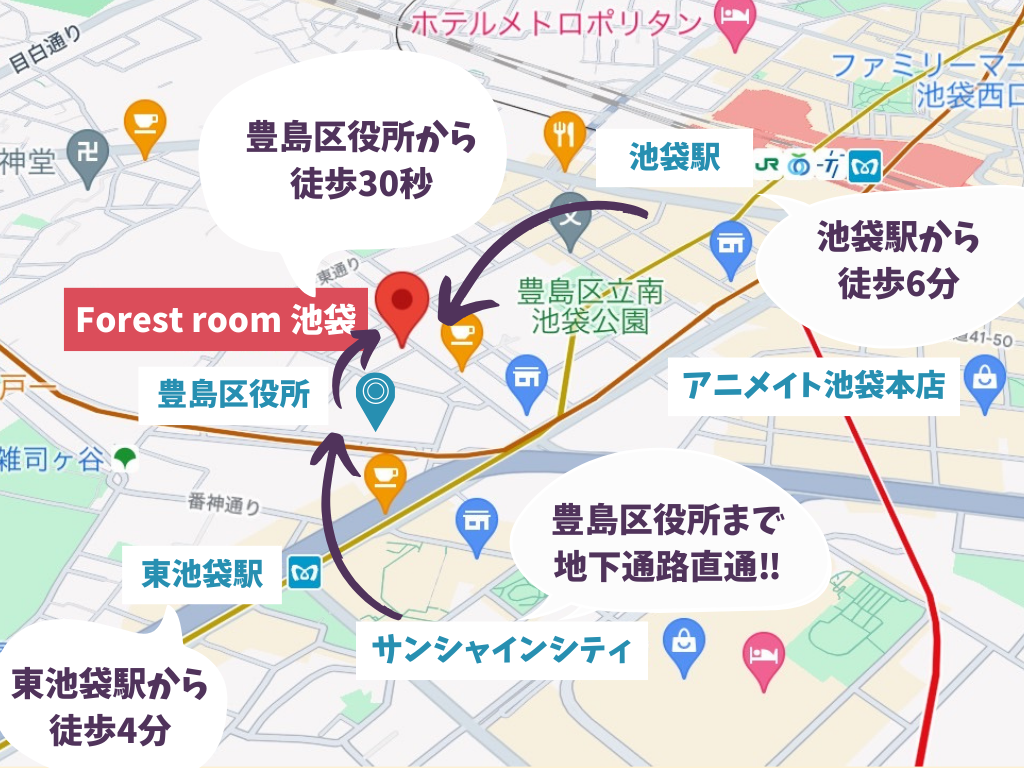 池袋駅6分&東池袋駅4分!サンシャインシティまで地下通路で楽々移動できるレンタルスペース「Forest room 池袋」