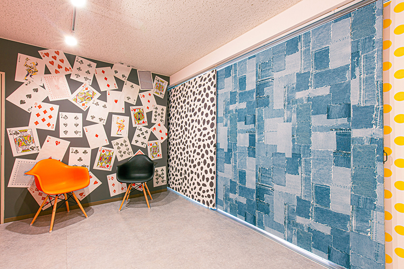原色カラーやはっきりした柄物の壁紙、家具や小物が多いカラフルでポップなお部屋です。