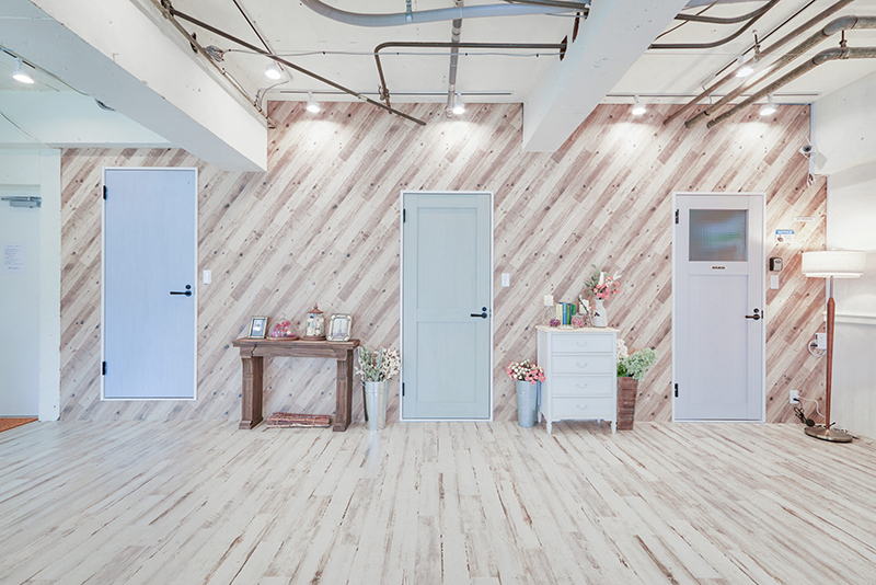 木目の壁面には3パターンのドアがあり、バリエーション豊富な撮影ができます。