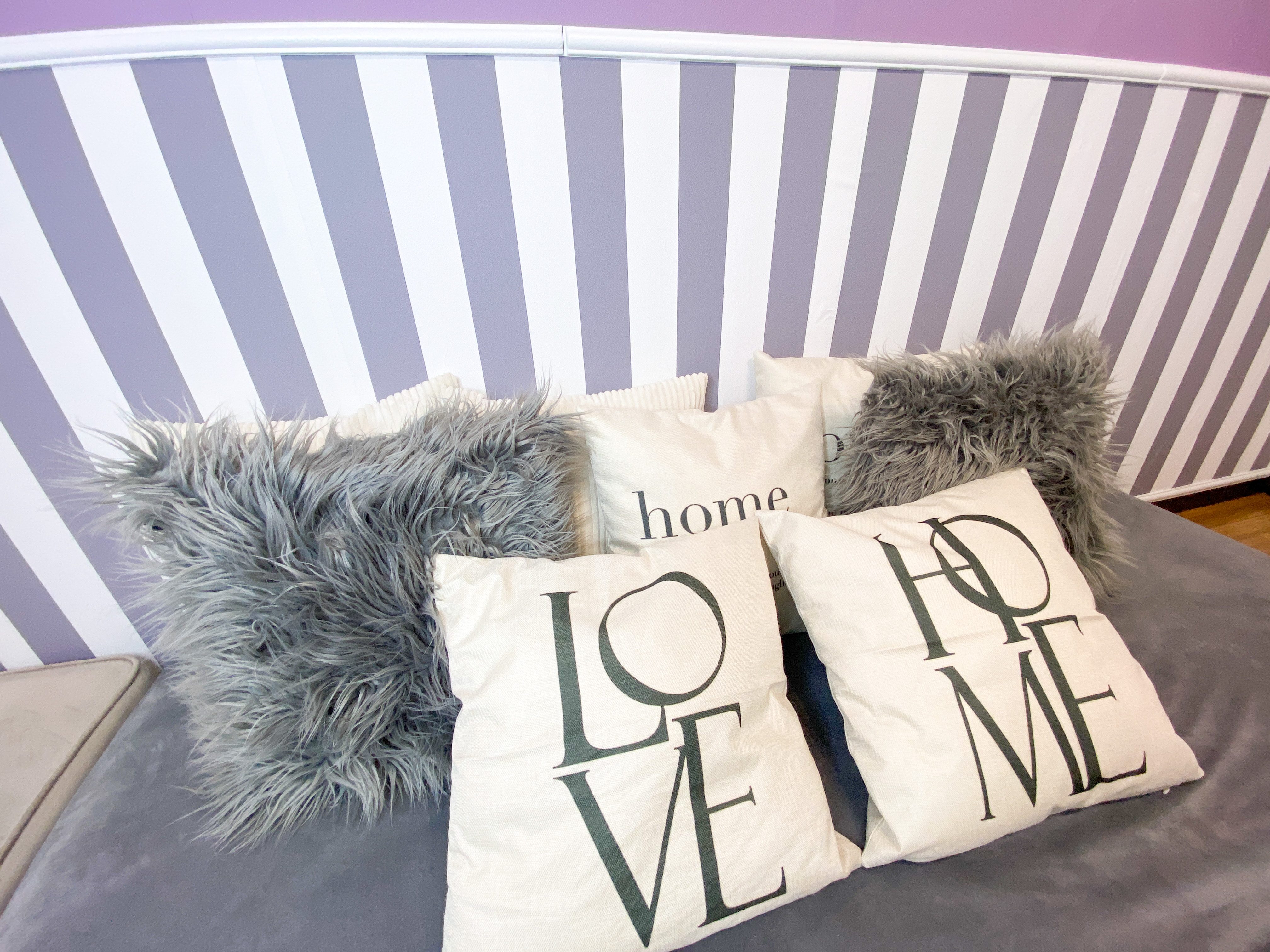 ストライプと紫の壁面にFrancfrancコンセプトのインテリアが充実のフレンチでかわいいスペースです。