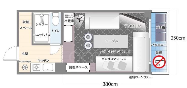 当スペースの間取りとなります。トイレやシャワースペースもございます。