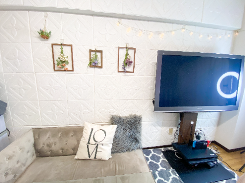 反対側はタイル調の白い壁面で、ガラッと印象の違う撮影が楽しめますよ。テレビももちろん使えますので、鑑賞会やゲームにも是非♪