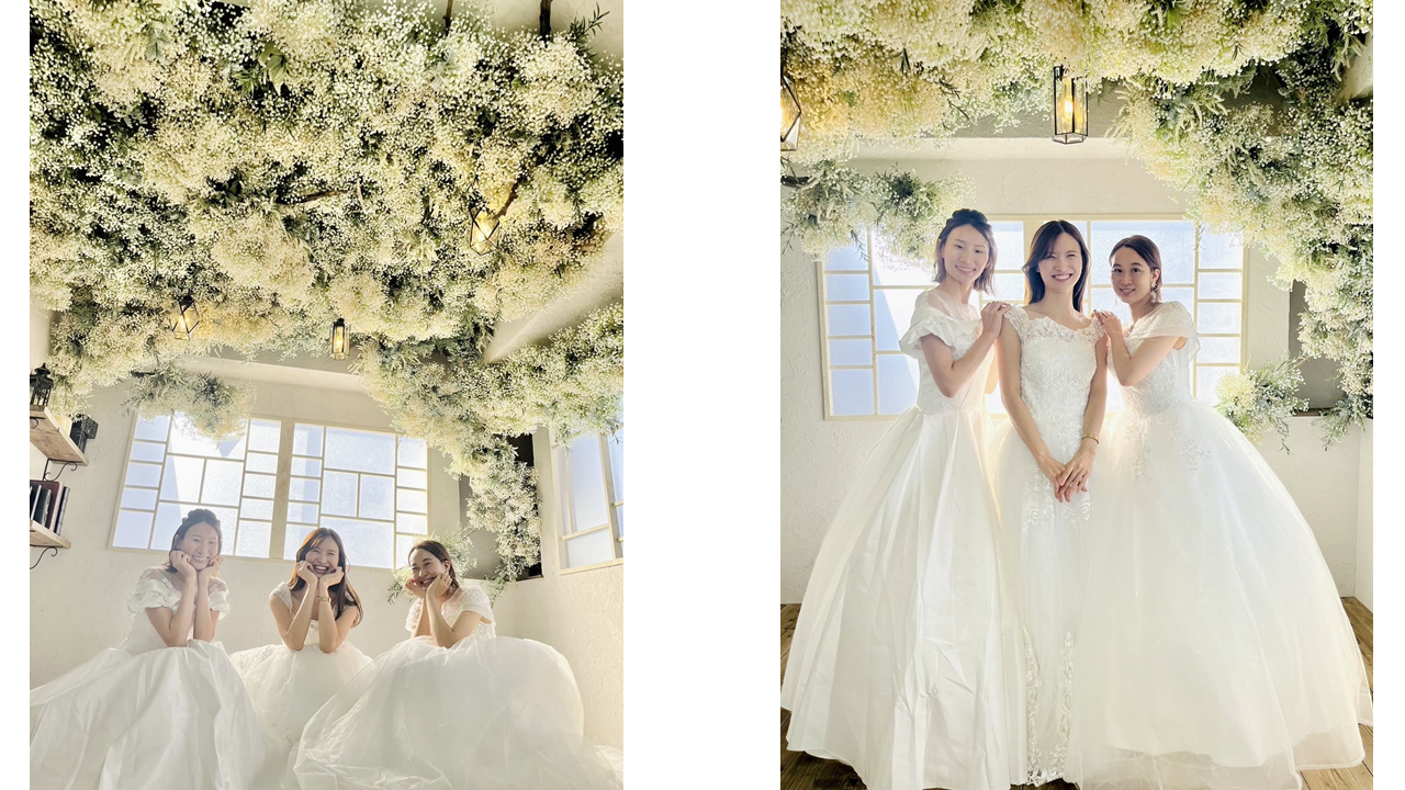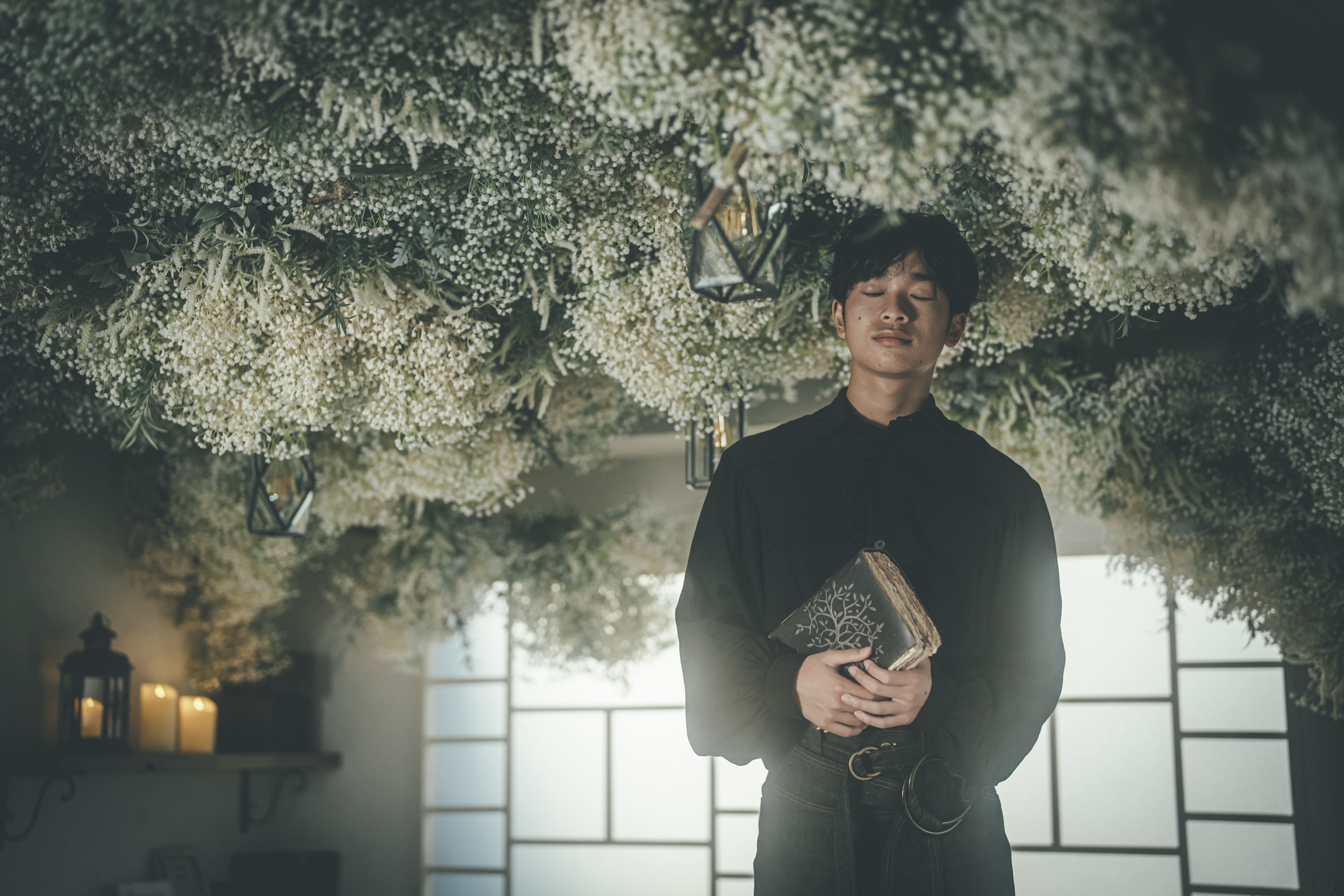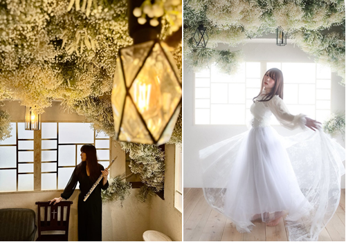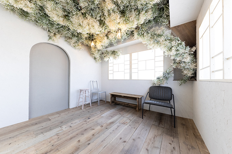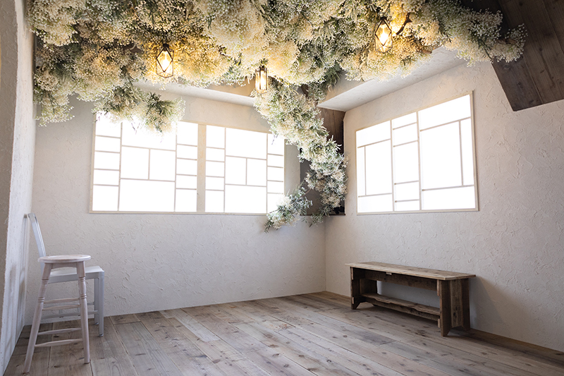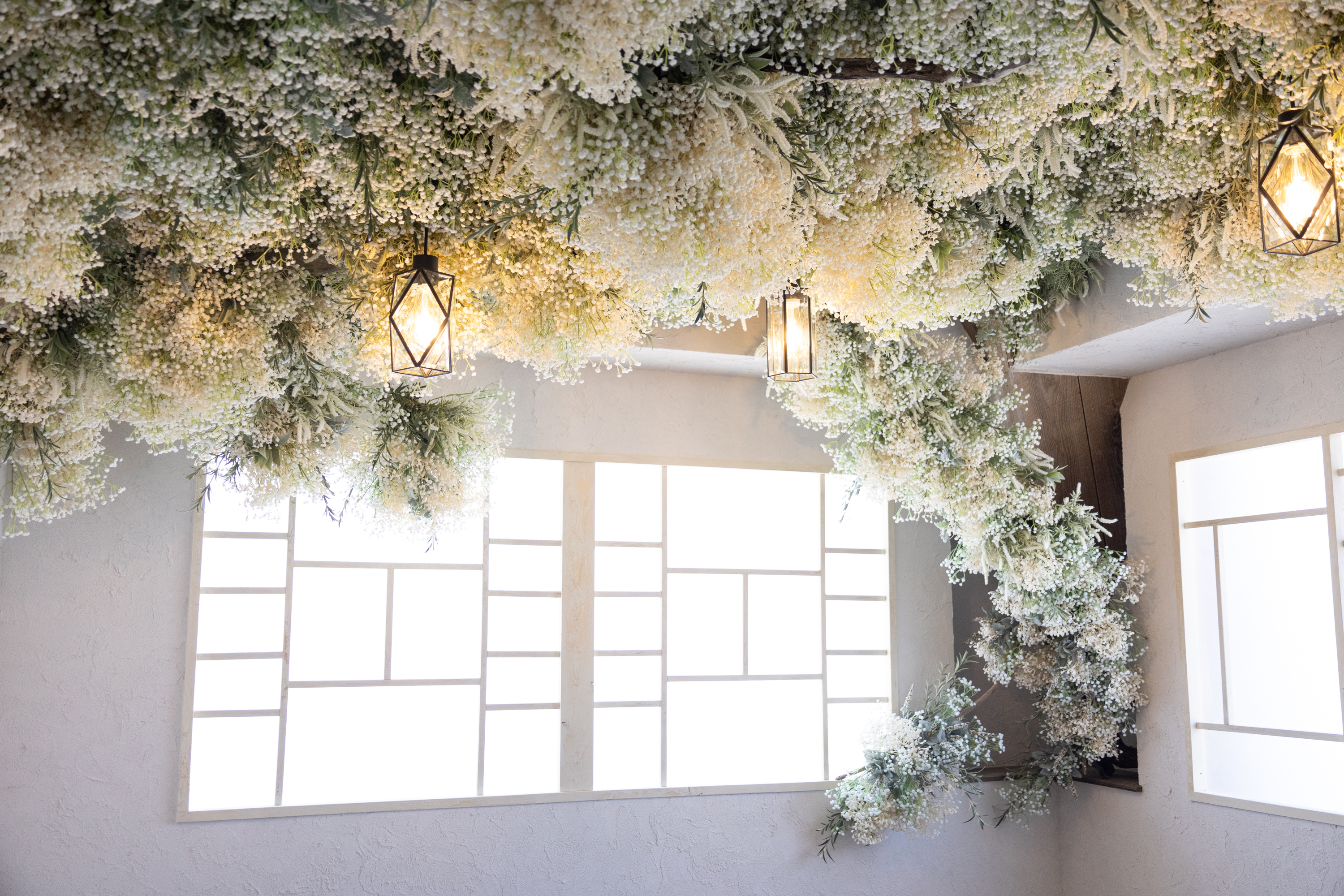 天井の1/3を埋め尽くすカスミソウドライフワラーを数千本使用した幻想的空間。