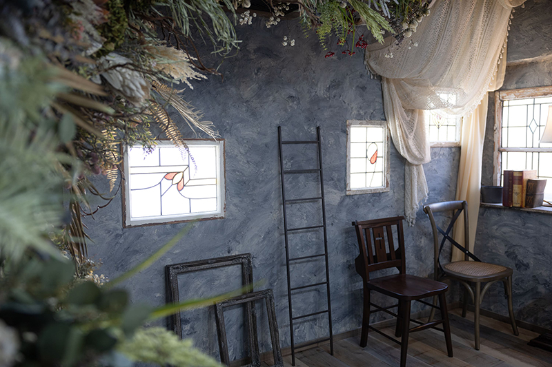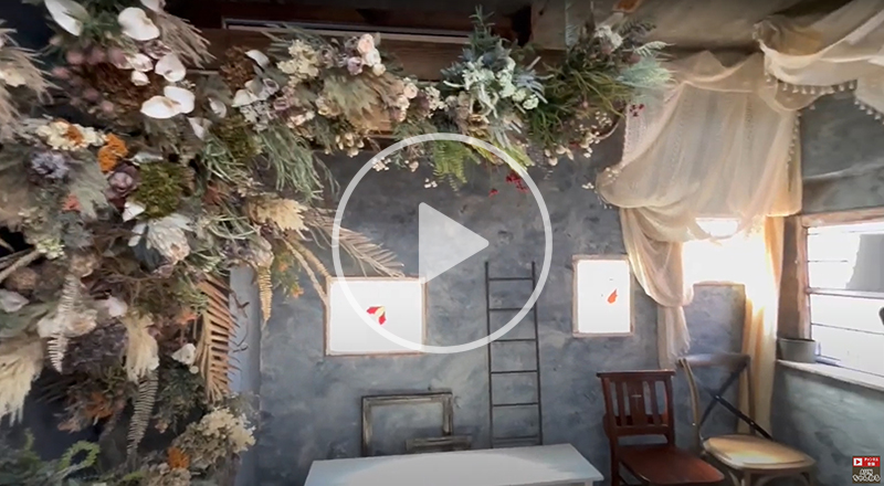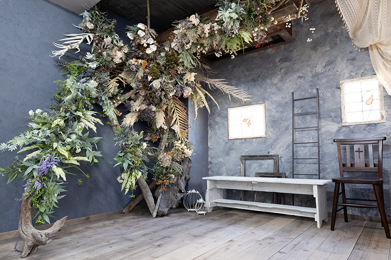 大型流木とこだわりのアーティフィシャルドライフラワーとフェイクグリーンをふんだんに散りばめた4mオーバーの幻想的オブジェにより、高クオリティの世界観と雰囲気を表現可能。