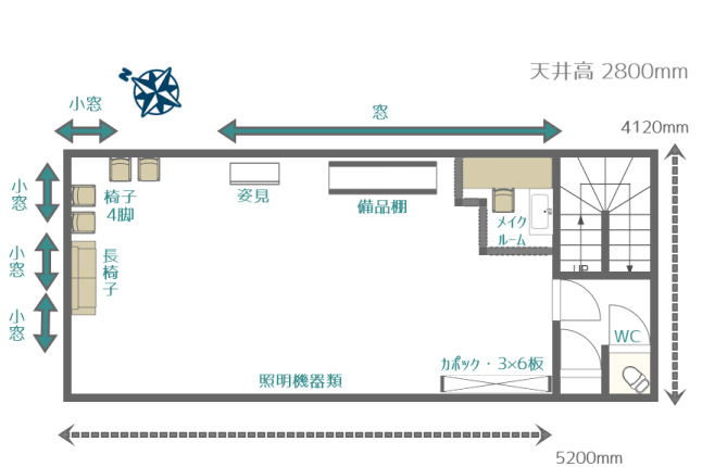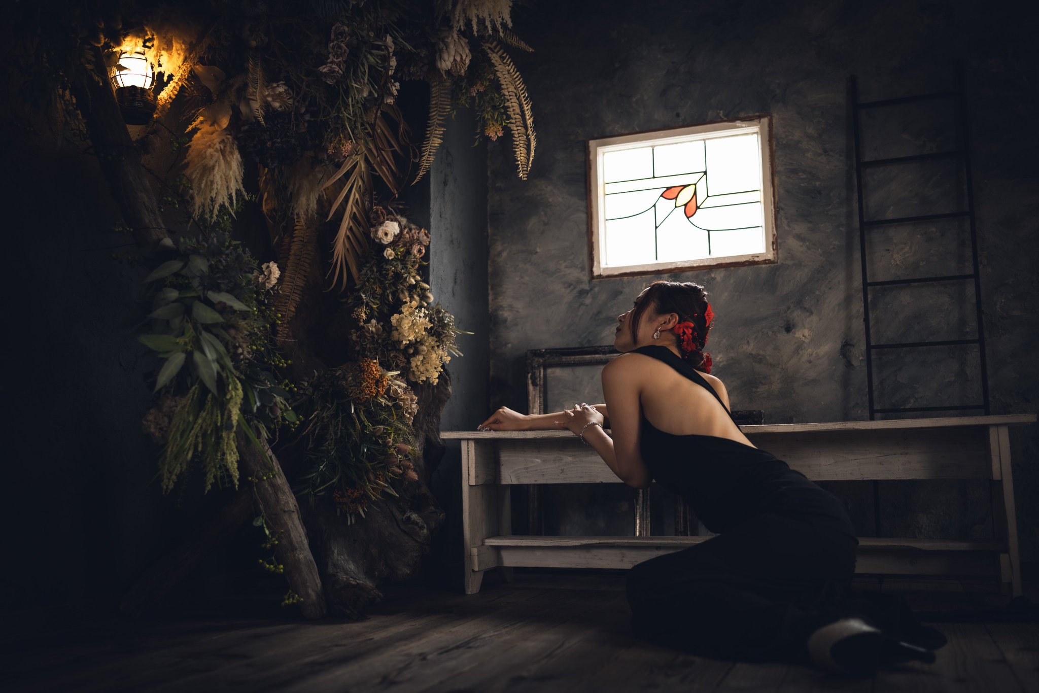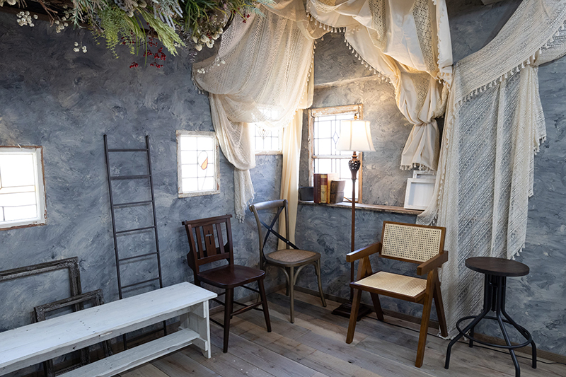 ヴィンテージランプやイミテーションブック、アイアンラダー、額縁、鳥かご、2人掛けホワイトウッドベンチやアンティークチェアなど撮影小物も充実で、カスタマイズ性も高い撮影スタジオとなっております。
