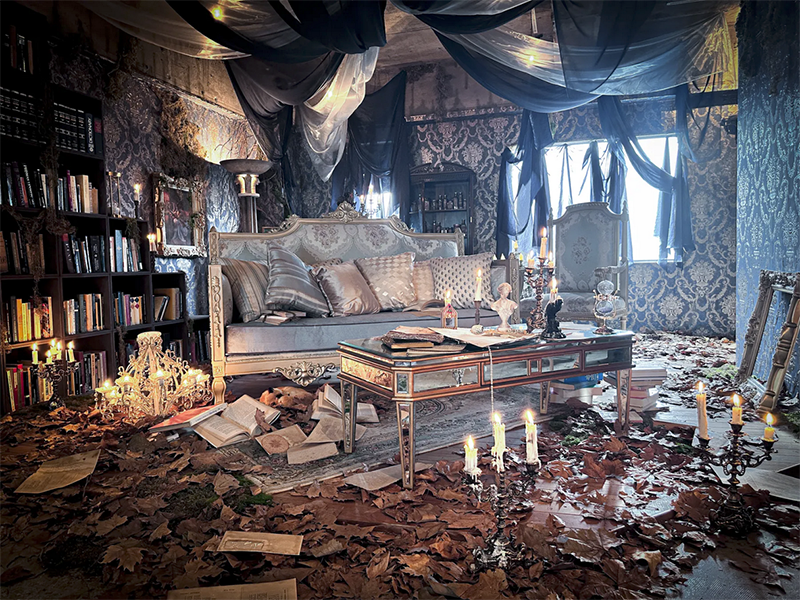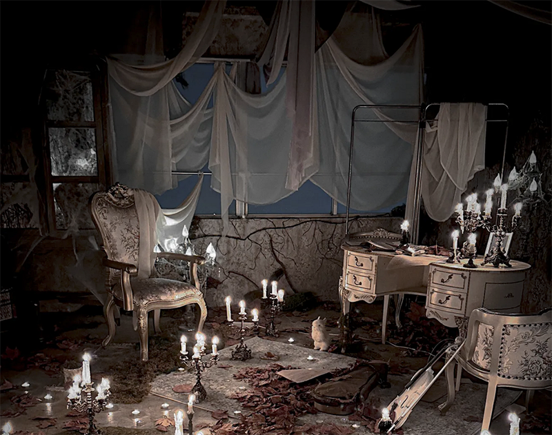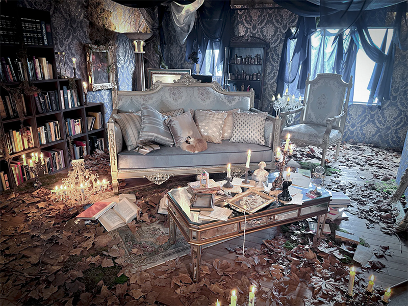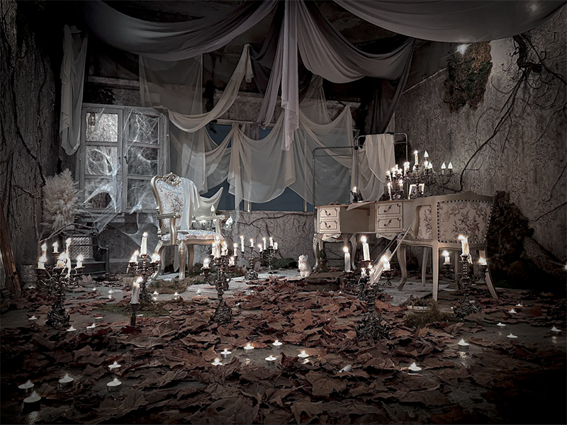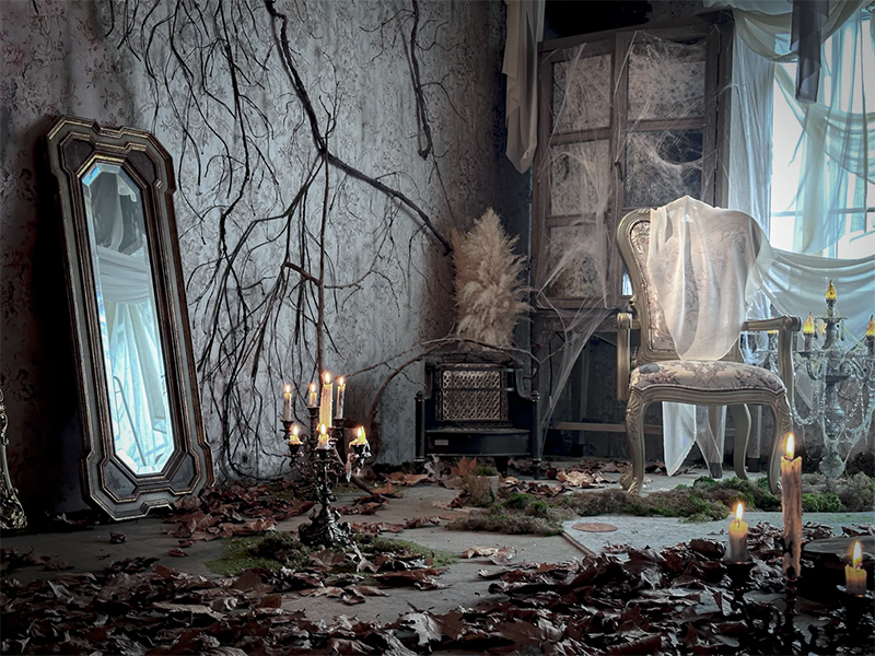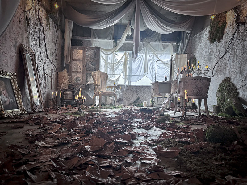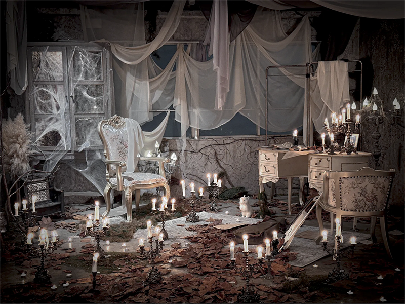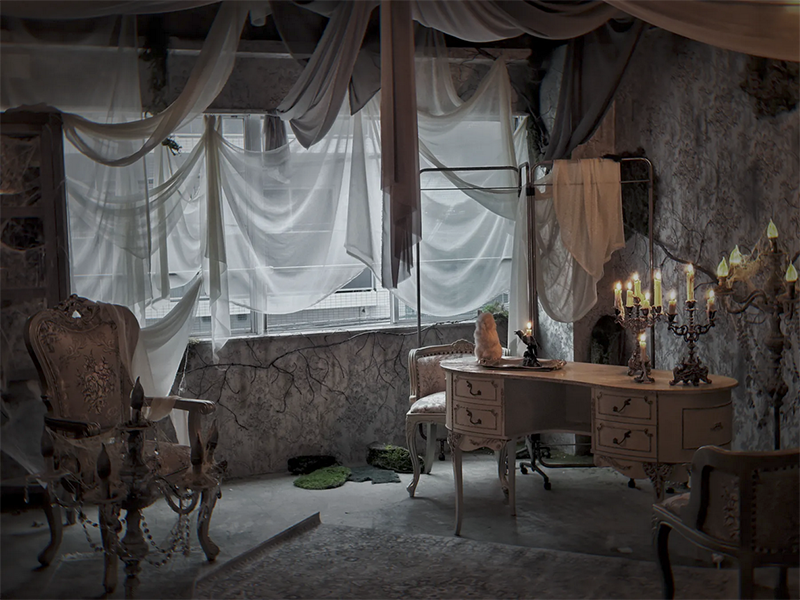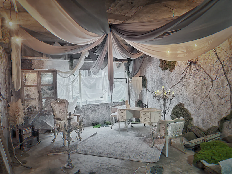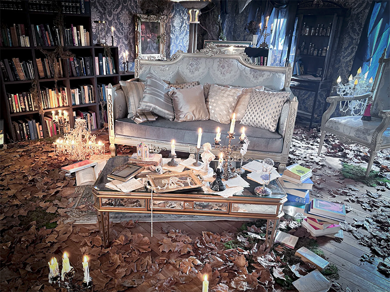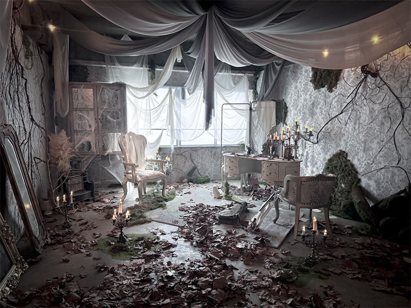 フランスのユーロヴィンテージものなどで構成され、色づいた葉が床面に散りばめられた、どこか廃墟を思わせる雰囲気が漂う幻想的な空間です。夜間撮影や有料でろうそくの火を使った撮影も可能です。