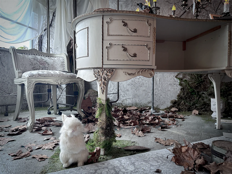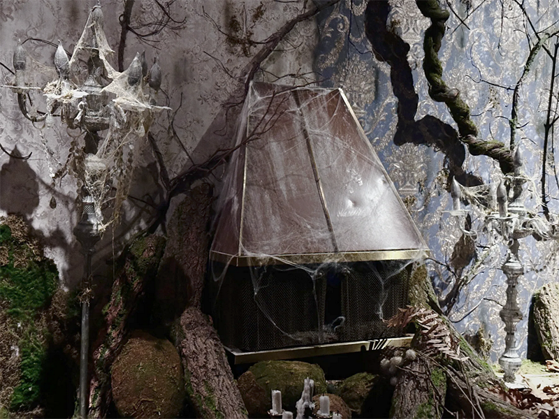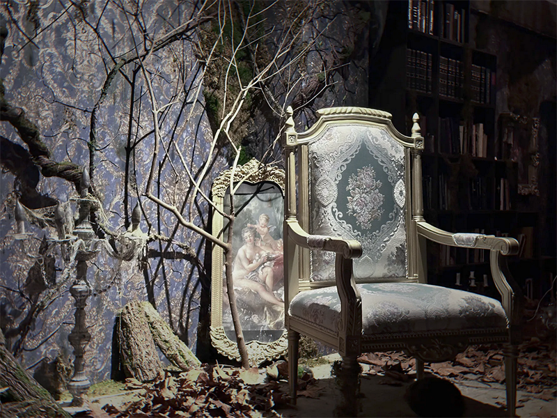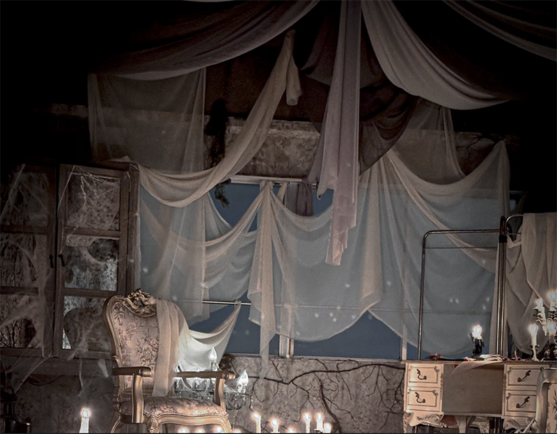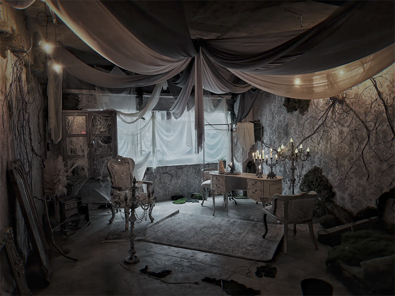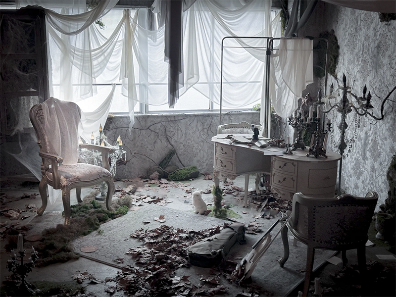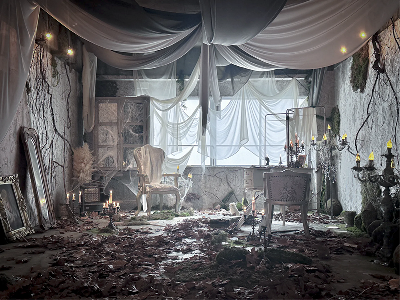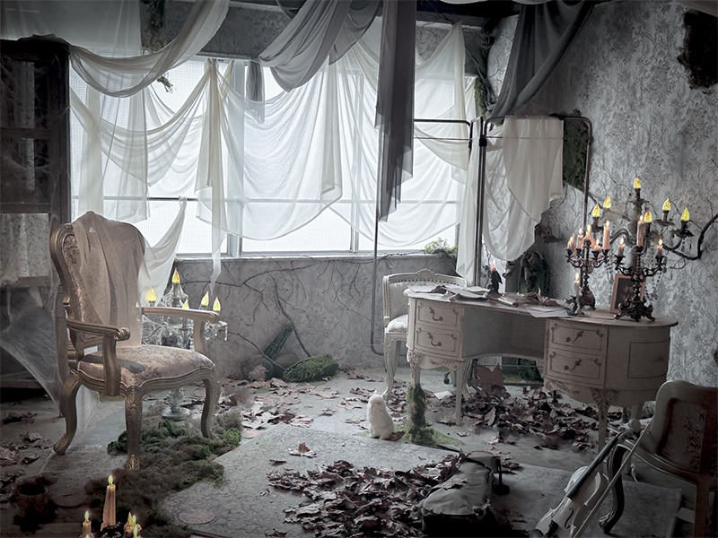 贅沢に使用したシースルーの布や退廃的な演出で廃墟を思わせる幻想的な世界観に。