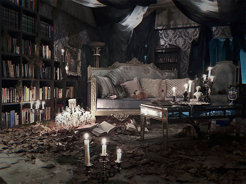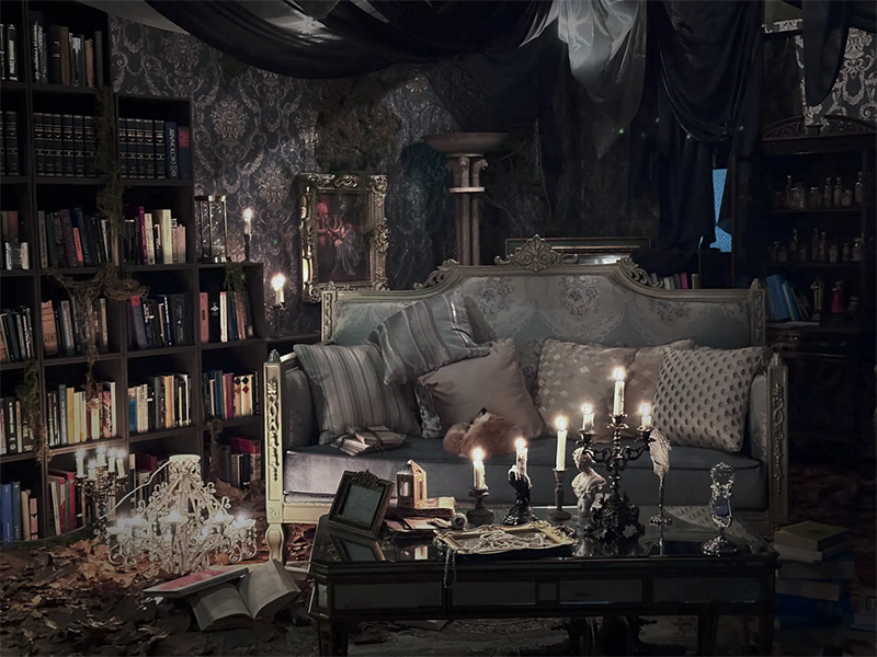 暗闇に浮かぶ重厚なインテリアと神秘的な装飾が、コスプレにぴったりのダークでエレガントな空間を提供します。